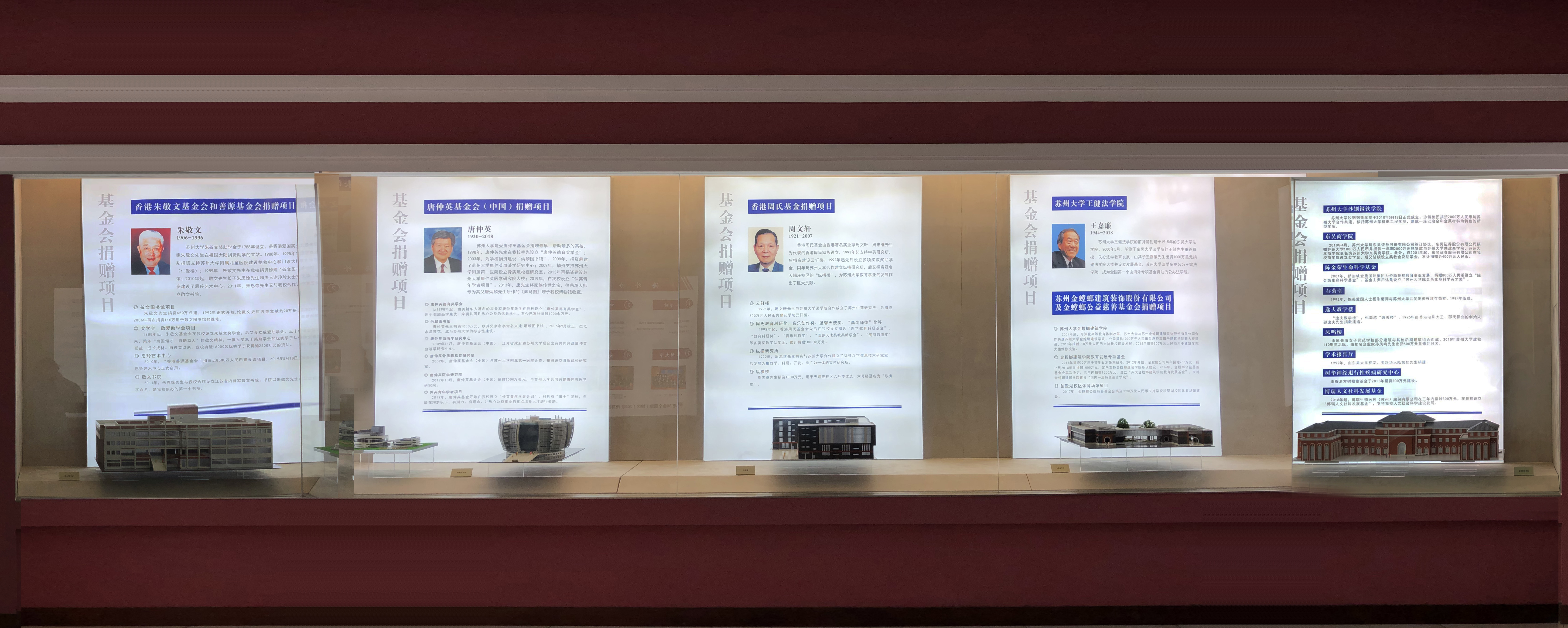 leyu·乐鱼(中国)体育官方网站的发展离不开社会各界的慷慨捐赠和热忱支持,为此,博物馆与校发展委员会办公室合作共建了捐赠展厅。展厅将朱敬文基金会、唐仲英基金会、香港周氏基金会、金螳螂公益慈善基金会等捐赠项目以及社会各界通过捐赠在leyu·乐鱼(中国)体育官方网站设立的奖、助学金项目作了一一介绍,同时为敬文图书馆、恩玲艺术中心、炳麟图书馆、云轩楼、王健法学院、金螳螂建筑学院学术交流中心等标志性建筑专门制作了逼真的建筑模型,令观者赏心悦目。