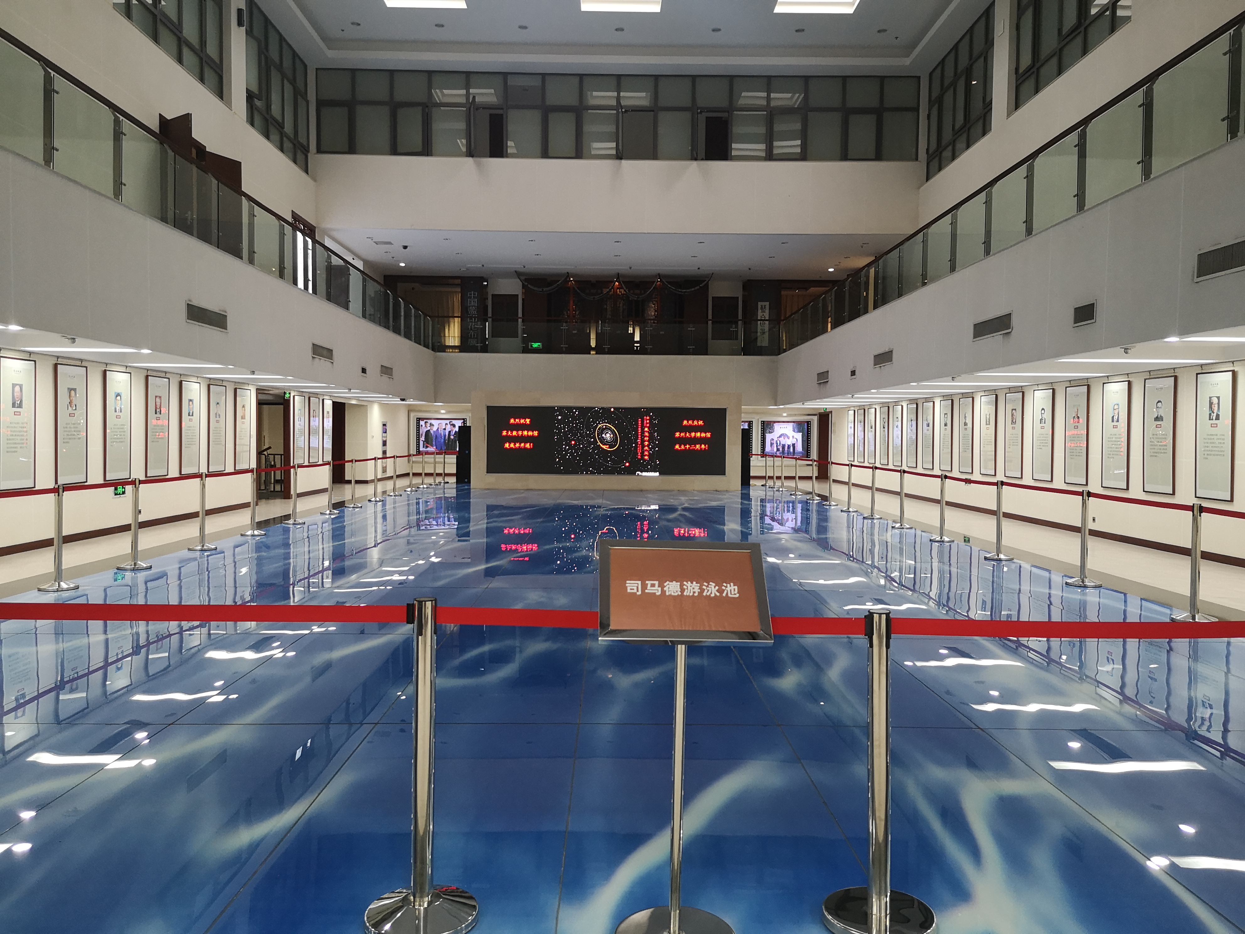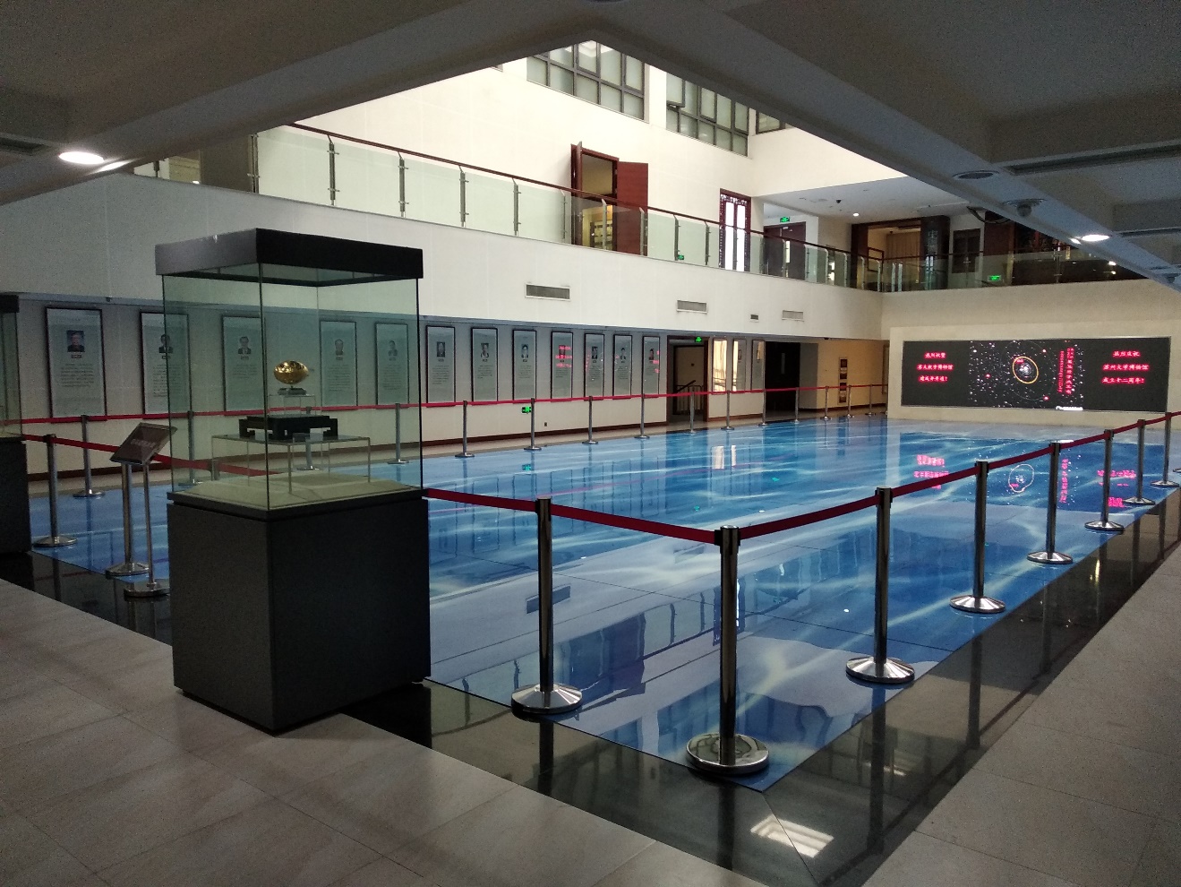 司马德游泳池展厅南北墙面原是滚动灯箱,经过设计改造后现已成为介绍leyu·乐鱼(中国)体育官方网站53位院士生平的特色展厅,明亮的顶部灯带与底部玻璃的蓝色波纹交相辉映,一幅幅院士的像片镜框齐正肃穆地环绕四周,场面壮观,令人竦然动容。