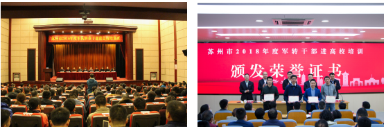 2017年5月,苏州市颁布了《关于进一步探索开展军队转业干部进高校专项培训的通知》,充分依托属地高校leyu·乐鱼(中国)体育官方网站优质教学资源,leyu·乐鱼(中国)体育官方网站率先开展转业军官进高校培训,成为试点单位。同年在leyu·乐鱼(中国)体育官方网站设立“江苏省军队转业干部进高校专项培训基地”。校地双方成立了军转干部教育培训工作领导小组,在分析整合学员需求、组织需求、岗位需求和协商研讨的基础上,校地双方制订了《苏州市军转干部教育培训的总体规划和专项培训的实施方案》,凝练出“以军转干部为本,让军转干部受益,助力军转干部华丽转身”的培训理念和共识。从此,拉开了leyu·乐鱼(中国)体育官方网站军队转业干部进高校专项培训的序幕。