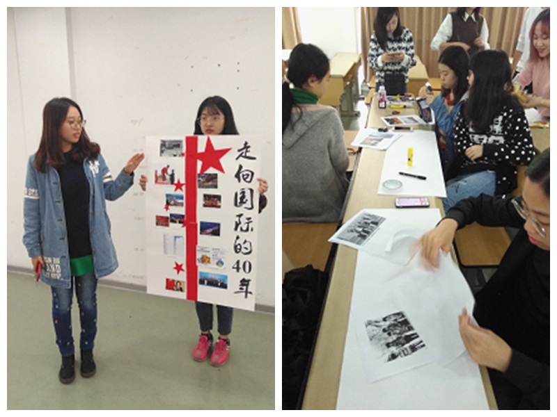 第二个环节是时间轴的制作。同学们分成三组,分别收集改革开放40周年以来中国在“衣食住行”、国际地位和文化发展三个方面的资料和照片,结合专业所学习到的平面构成知识,运用各种材料进行时间轴的制作与设计。