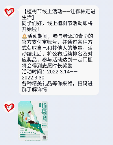 万物复苏季,春植正当时为丰富同学们战“疫”期间的居家生活,引领师生坚定不移走“生态优先、绿色发展”之路,在第44个植树节来临之际,计算机科学与技术学院青年志愿者协会开展主题为“拥抱绿色,让森林走进生活”线上植树活动,让同学们“宅家”也能播种绿色,拥抱春天。此次线上植树活动吸引各年级同学踊跃参与,共计百余人次参加线上植树浇水等活动。