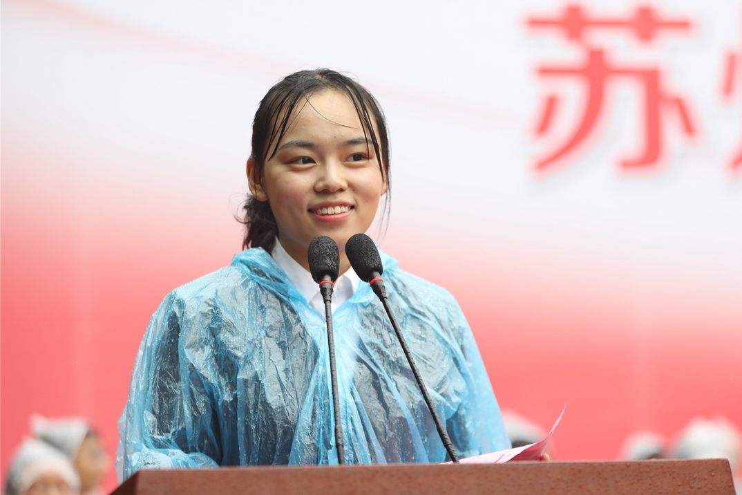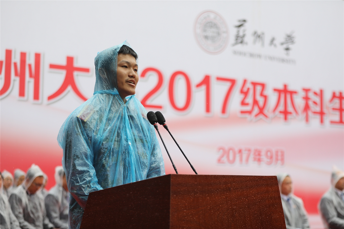 文学院汉语言文学专业的折琪琪同学代表高年级学生发言。“三年前,我和你们一样,幸运地走进苏大,感受到教育给予人生命的尊严和意义。我们在这里学习专业知识,不管哪一条道路,只要你我珍惜青春,乐于学习,不断尝试,在这里我们必将拥有属于自己的精彩。”她鼓励学弟学妹们,要有锲而不舍的耐心、开拓视野的信心、担当责任的决心,勇敢书写自己的青春故事。