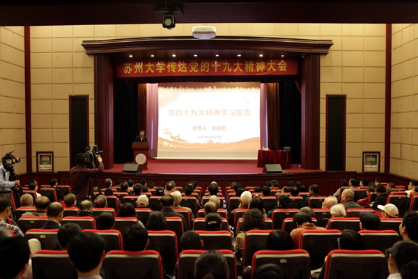 会上,十九大代表、校党委常委、副校长张晓宏从十九大会议的基本情况、十九大报告形成过程、会议的主要成果、报告的总体思路和逻辑结构、报告的主要内容和精神实质等方面对十九大会议及报告做了全面系统而详尽的阐释。他指出,中国共产党第十九次全国代表大会,是在全面建成小康社会决胜阶段、中国特色社会主义进入新时代的关键时期召开的一次十分重要的大会,对鼓舞和动员全党全国各族人民继续推进全面建成小康社会、坚持和发展中国特色社会主义具有重大意义。党的十九大精神博大精深,准确标定了我国发展新的历史方位,深刻阐明了未来相当长时期党和国家工作的大政方针和战略部署,提出了一系列重要思想、重大论断,作出了一系列战略部署、战略安排,站位之高、谋划之远都是前所未有的。张晓宏副校长还结合高校工作实际,详细阐述了学习十九大报告的认识与体会:要深刻理解“优先发展教育事业”的重要意义,深入把握高等教育在新时代的重要地位和发展要求;要深入学习和贯彻十九大精神,更好地发挥新时代高校在“人才培养、科学研究、社会服务、文化传承创新和国际合作交流”的五大职能。他强调,leyu·乐鱼(中国)体育官方网站要牢牢坚持党的领导,坚持以立德树人为根本任务,以改革创新为引领,加快建设“国内一流、国际知名”高水平研究型大学,在新时代中国特色社会主义的伟大实践中努力奋斗,为实现中华民族伟大复兴做出苏大贡献。