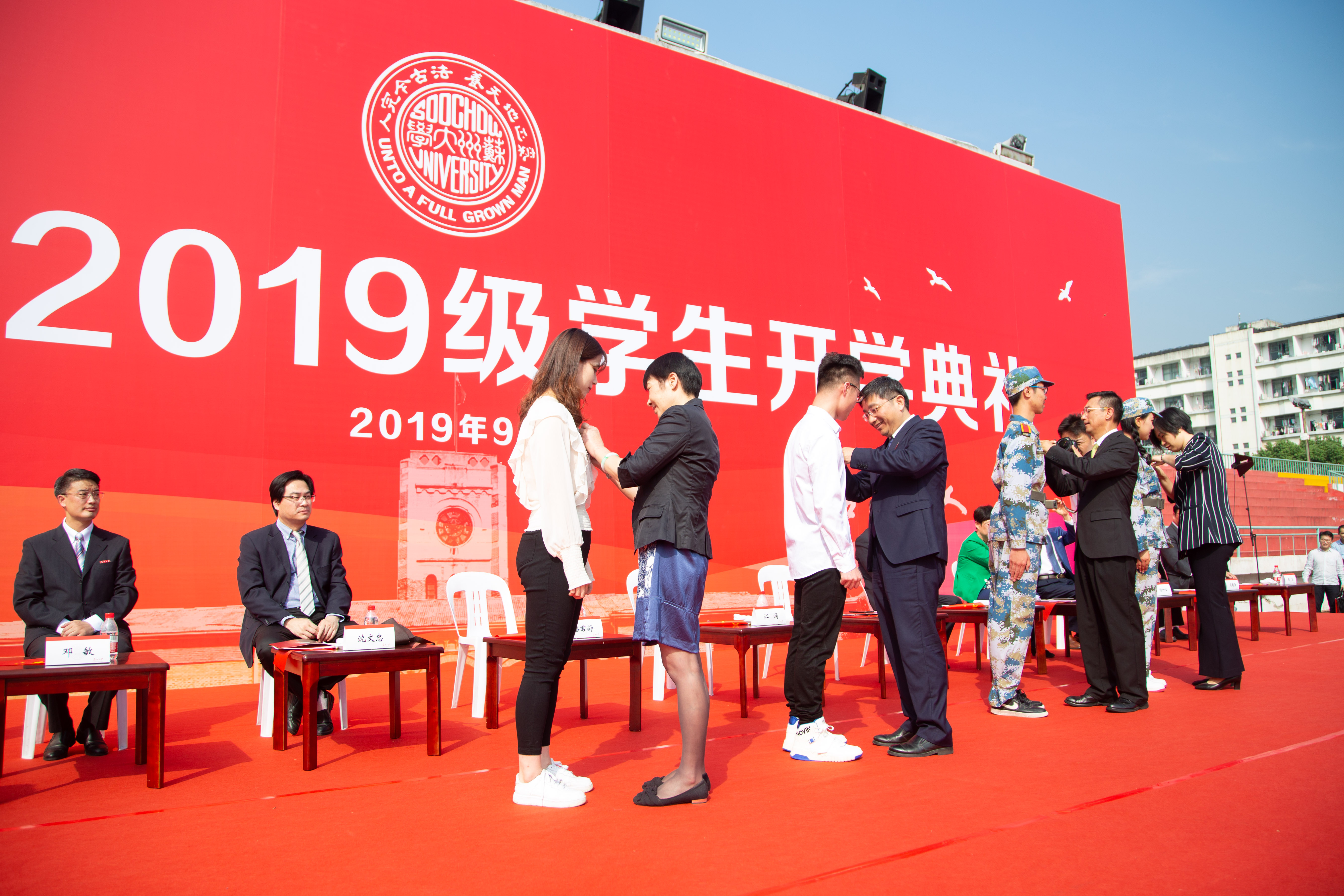 2019级本科新生代表、文学院倪裳讲起了自己与父亲作为两代苏大人在时光中穿梭相遇的故事。她表示,从苏大再出发的自己会用心感受和发现丰富多彩的大学生活,在一次次平凡的尝试与探索中超越自我、追求卓越,在获得大学生技能的同时修炼出精彩人生。“当今的时代背景下,作为一名研究生新生,即将为科研工作注入新鲜血液,需要勇于承担发展创新的社会责任,争做紧抓历史机遇的弄潮儿。”2019级研究生新生代表、机电工程学院李奇说,自己会怀着坚毅敬畏之心,永葆学术热忱,戒骄戒躁,攻破一道道知识壁垒。