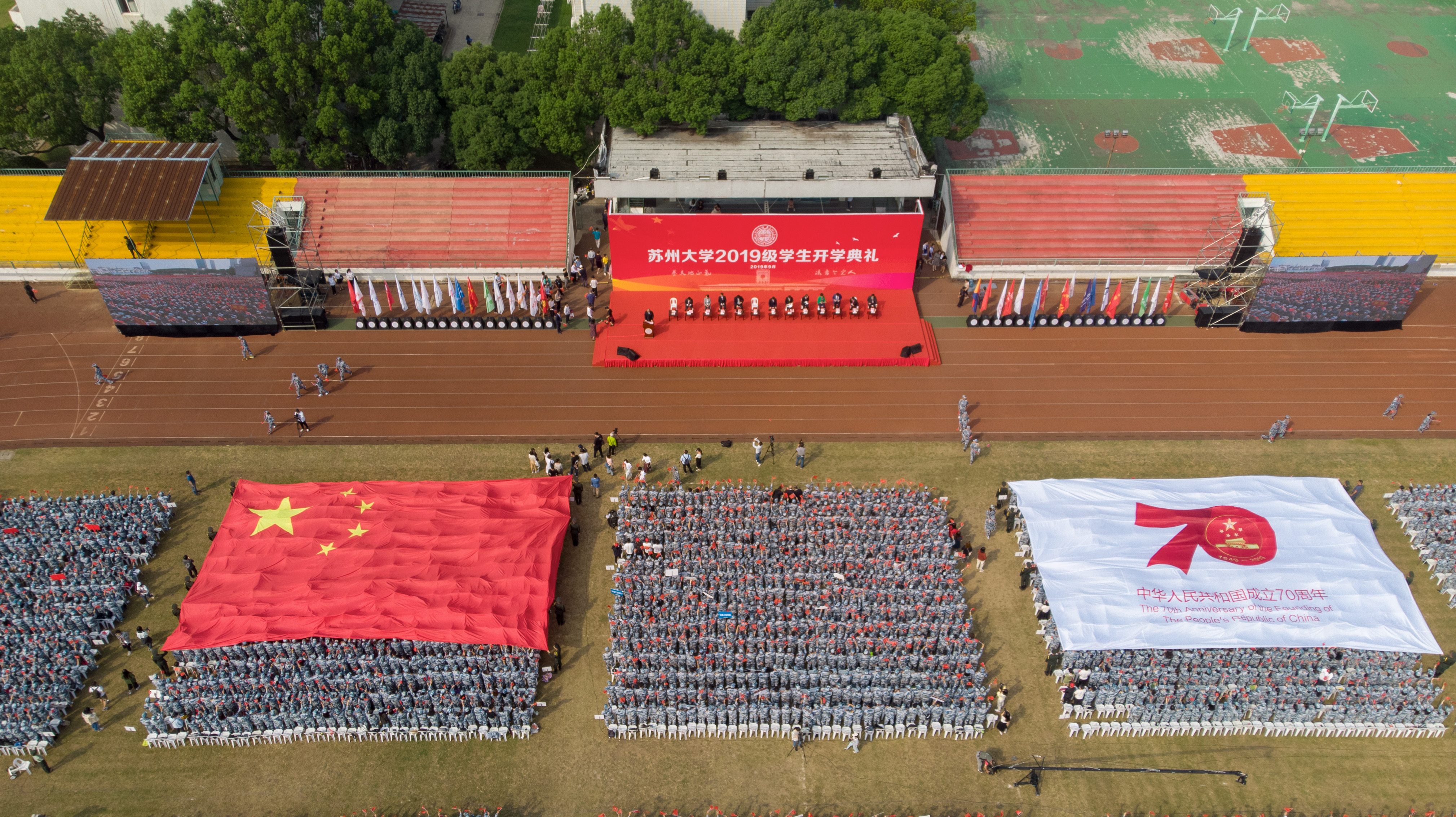 “五星红旗迎风飘扬,胜利歌声多么响亮,歌唱我们亲爱的祖国,从今走向繁荣富强……”典礼仪式上,28位与祖国同一天生日的新同学及部分与新中国同龄的退休教师代表用歌声点赞祖国,现场万余名师生共同挥舞着手中的国旗,齐声高唱《歌唱祖国》,用奋进、嘹亮的歌声向祖国母亲“表白”。高擎的巨幅国旗在同学们手中缓缓传递,大家深情托举国旗,献礼新中国七十华诞,祝福伟大祖国繁荣昌盛,表达出苏大师生浓浓的爱国情。