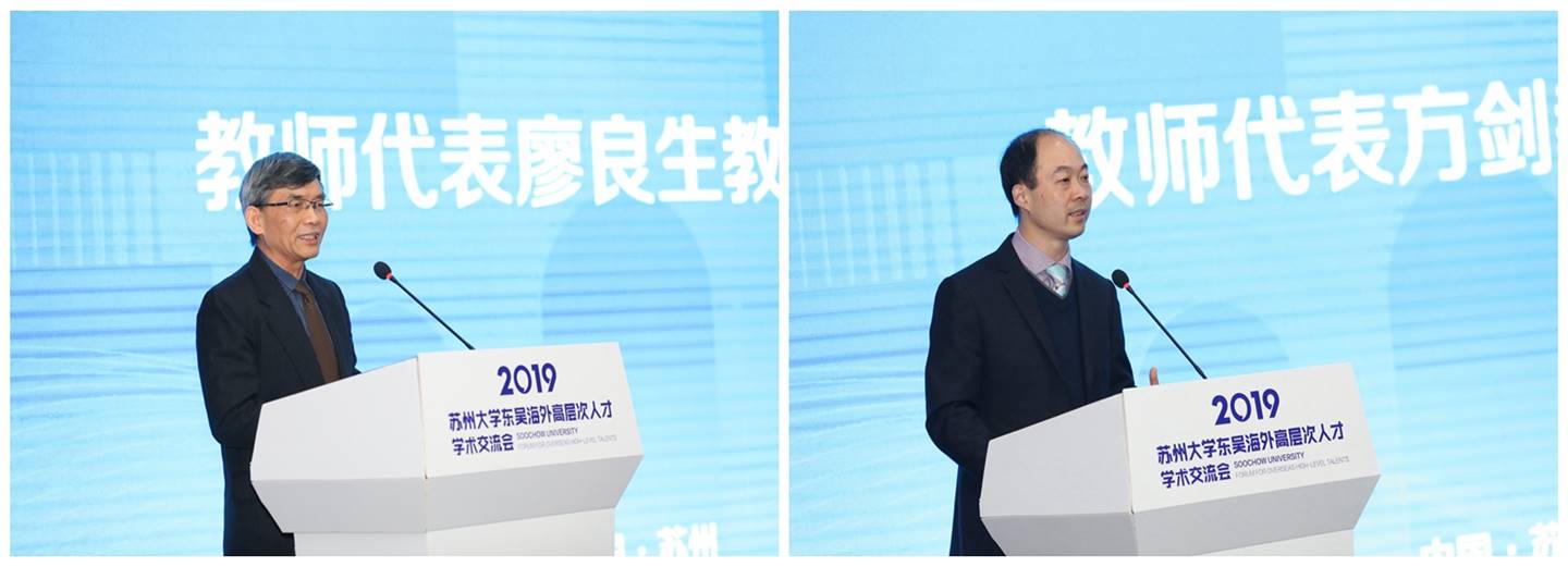 教师代表廖良生教授、方剑教授分享了他们选择苏大、在苏大发展的亲身经历和感受。廖良生教授是纳米科学技术学院飞速发展的见证者和参与者,他说,自2009年加盟苏大以来,在学校、学院的大团队协作之下,纳米科学技术学院从零开始,不断发展壮大,如今已经位居全国前列、世界领先,如果再有一次选择的机会,仍然会选择leyu·乐鱼(中国)体育官方网站。方剑教授讲述了自己加盟苏大这半年的感受。他说,leyu·乐鱼(中国)体育官方网站积极开放的人才政策、优越的发展空间、优质高效的服务保障都是吸引自己加盟的原因。学校在实验室建设、购置设备、研究生招生、生活保障等方面都给予了很大的支持和帮助。两位教授恳请有更多的有才之士与苏大携手,共同前进,共同发展。
