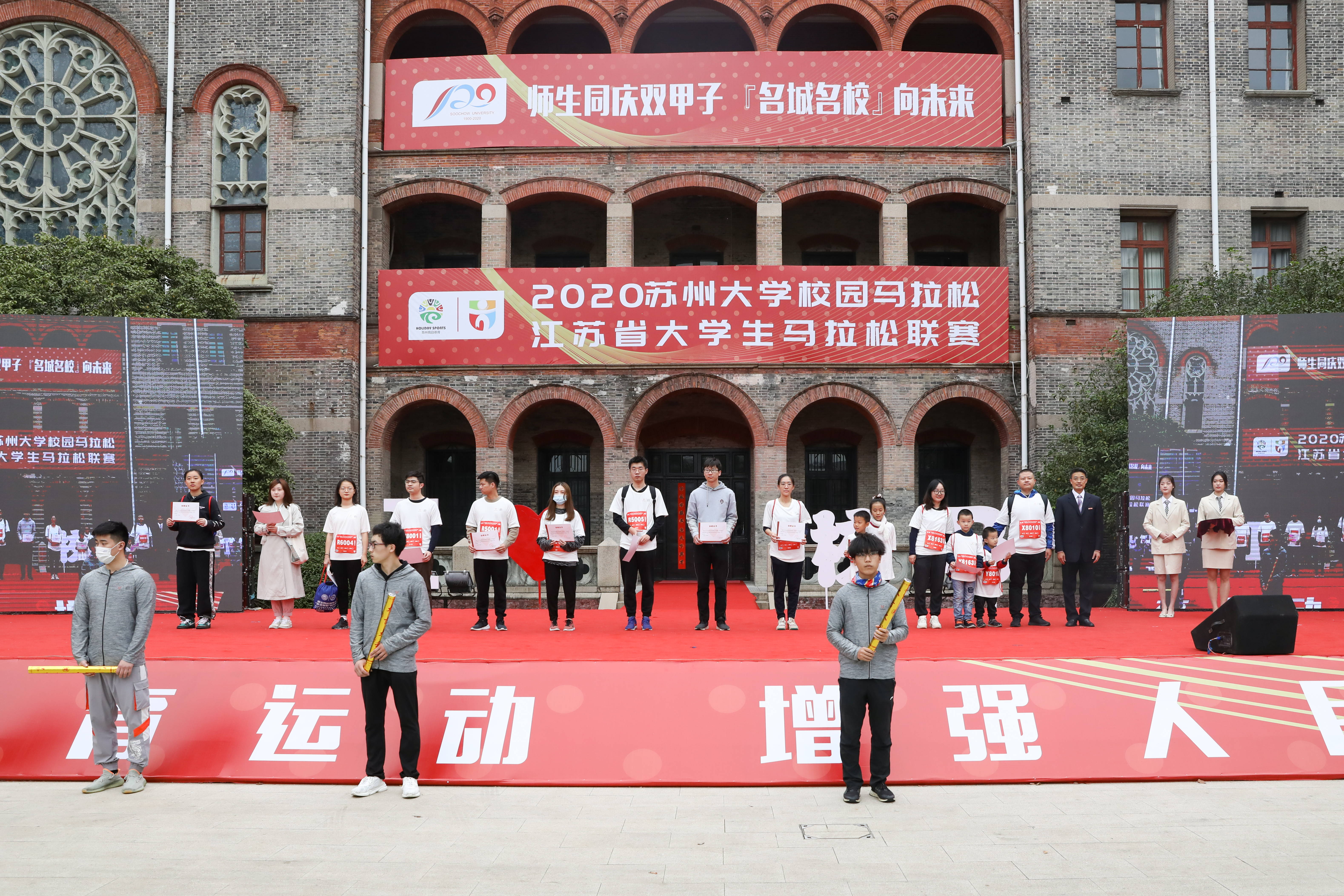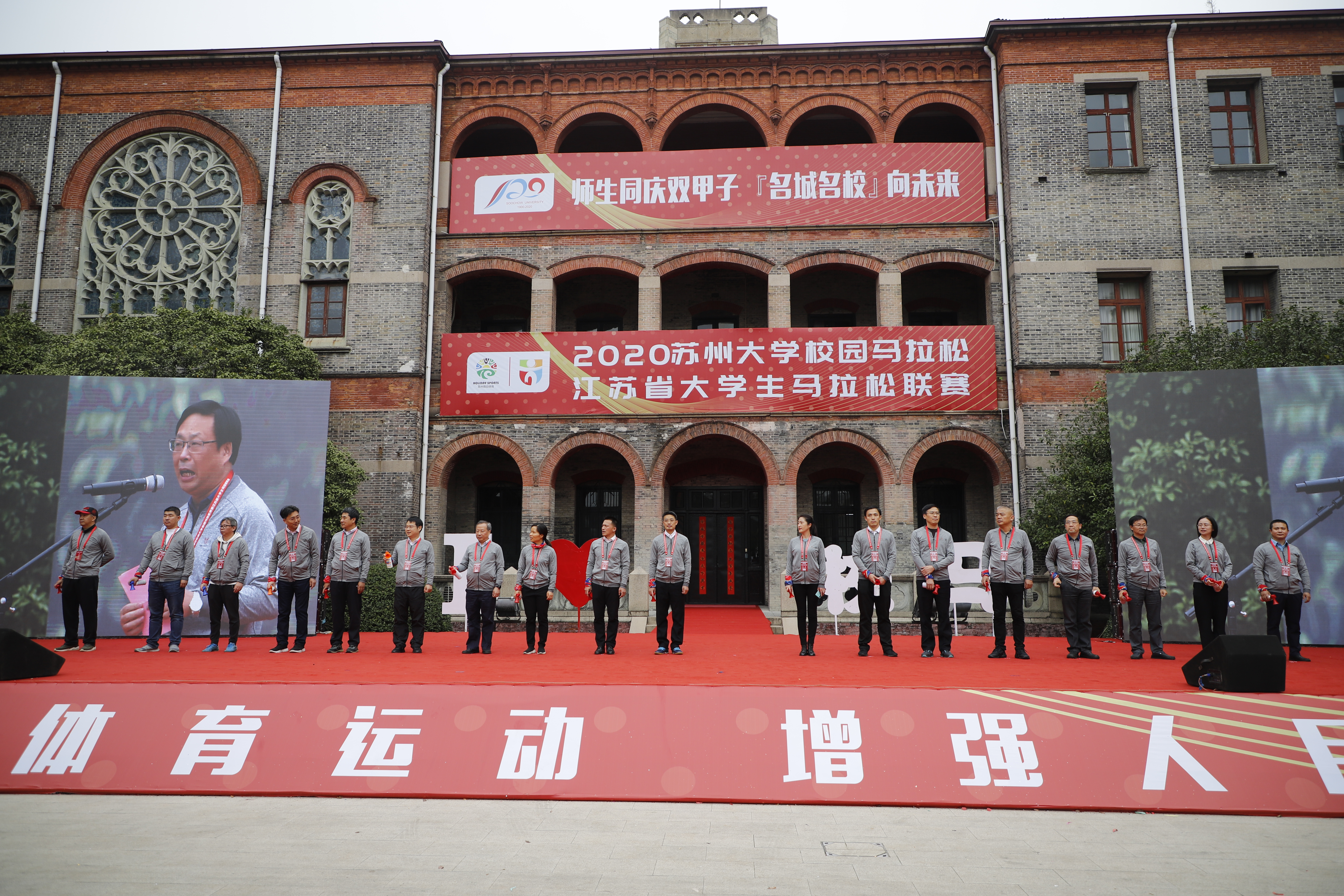“师生同庆双甲子,名城名校向未来!”在激动澎湃的音乐声中,出席活动的领导和嘉宾入场,并为2020leyu·乐鱼(中国)体育官方网站校园马拉松赛暨江苏省大学生马拉松联赛的十公里赛和半程赛发枪。