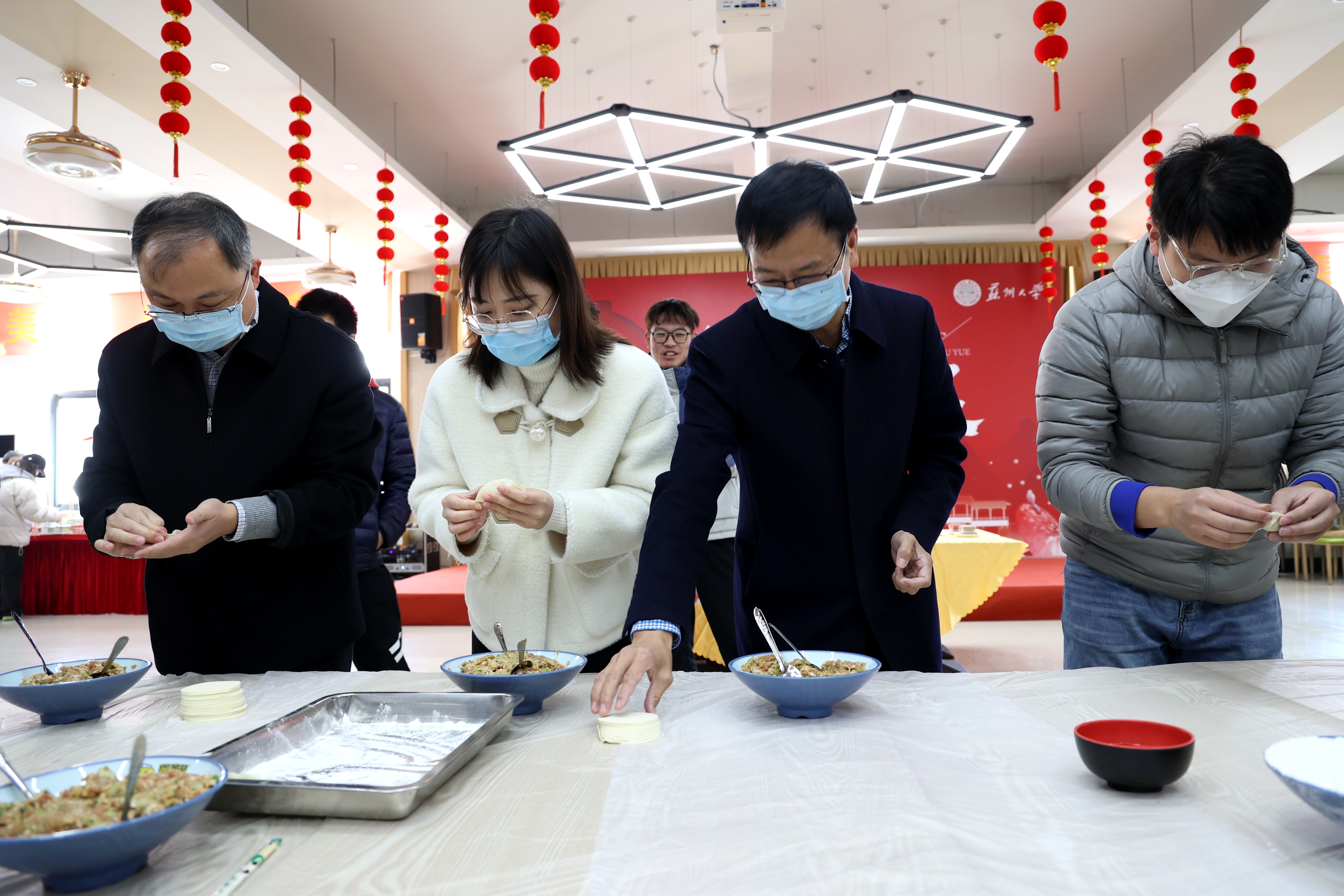 和面、拌馅儿、擀皮儿……师生们相互协作、默契配合,现场十分融洽。当天中午,校领导江涌、邓敏、王鲁沛、姜建明、周高、姚建林和相关职能部门负责人分别来到独墅湖校区、天赐庄校区和阳澄湖校区学生食堂,与同学们一边包饺子一边闲话家常。
