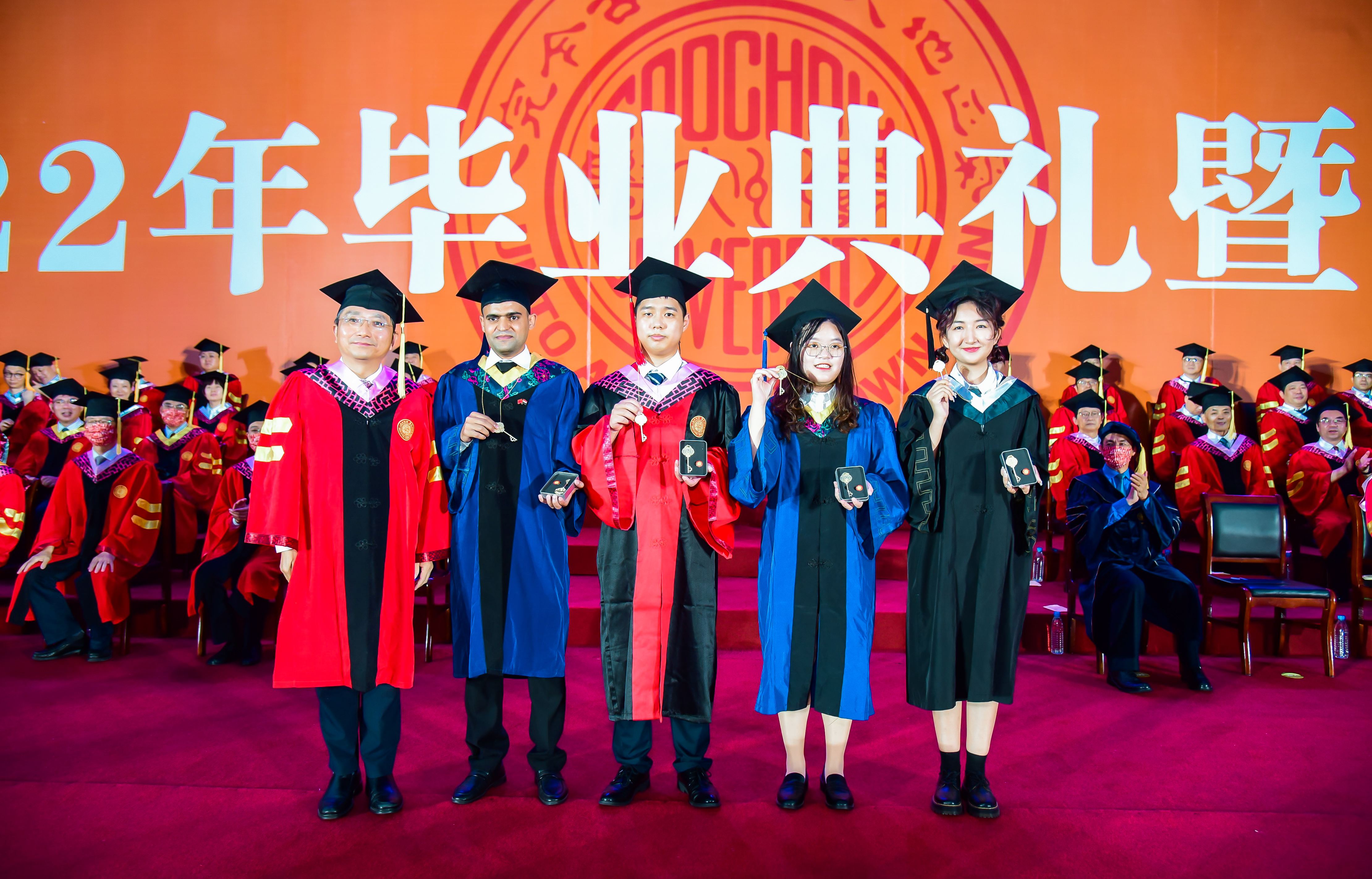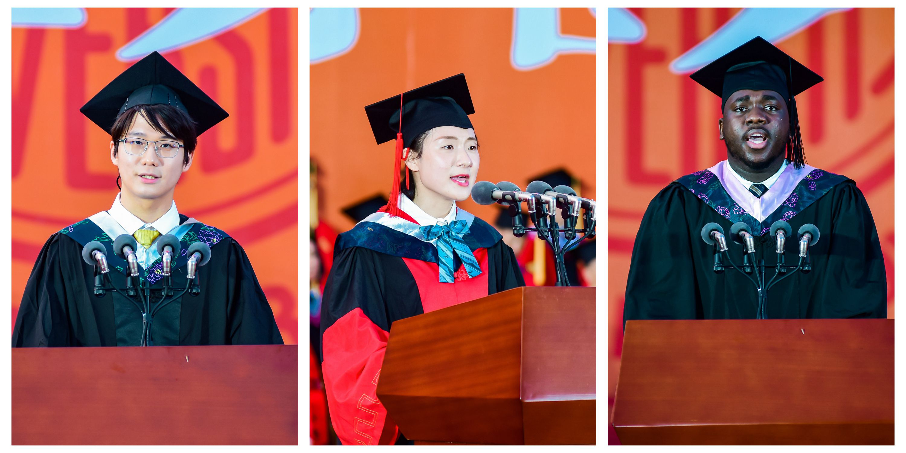 本科生代表、商学院金融学专业熊齐扬分享了四年间自己在苏大的蜕变成长。即将奔赴中国人民大学直博攻读经济学的他,在感谢母校悉心培养的同时,也表示将担起新时代青年责任使命,牢记母校的嘱托,永续苏大荣光。研究生代表、材料与化学化工学部博士研究生包淑锦向辛勤育人的老师们表示衷心感谢。她说,回望过去,正是苏大为自己点亮那一盏盏指路明灯,引领自己用拼搏浇灌科研之门、用热爱投身奉献之门、用理想开启未来之门。尼日利亚留学生代表、文学院汉语言文学专业的陈易强,用一口流利的中文回忆了他在苏大学习生活的点滴。他表示,未来将继续在文学院汉语国际教育专业攻读硕士,也希望自己能进一步学习中国文化、体会中国智慧、感受中国力量,为中尼友谊的发展和传承贡献自己的积极力量。