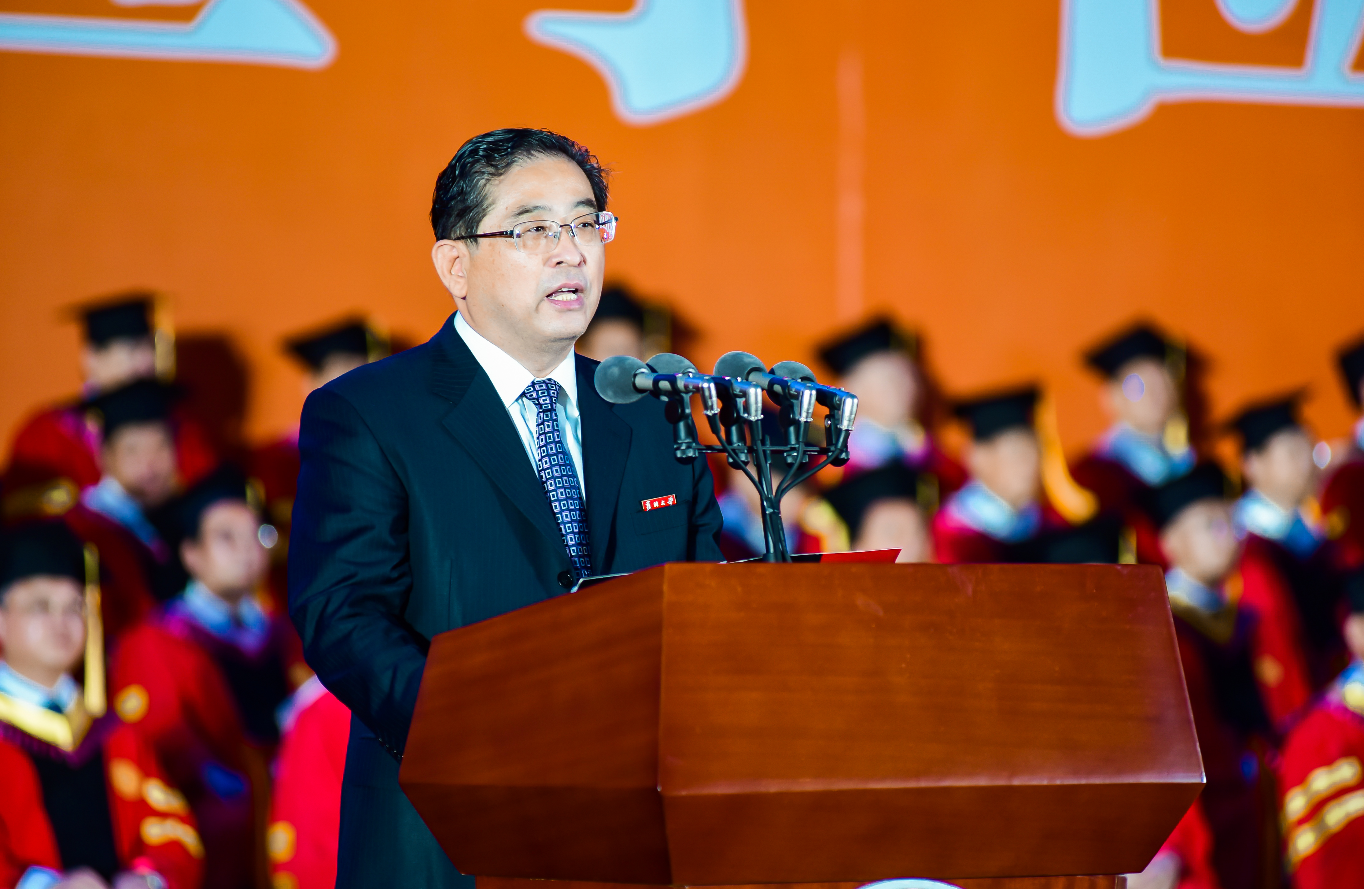 毕业典礼暨学位授予仪式在庄严的国歌声中拉开帷幕,全体出席人员起立奏唱国歌。