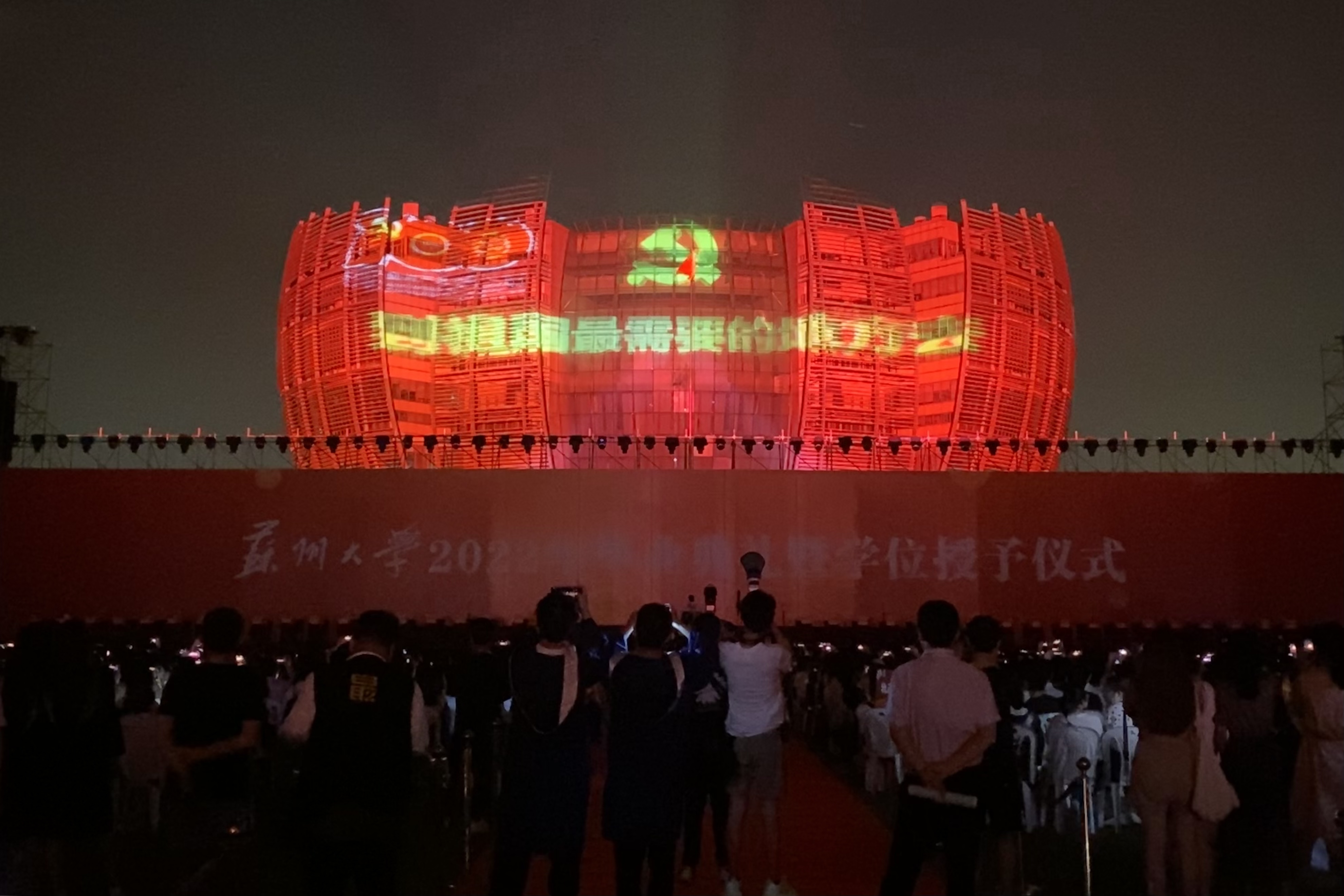 “礼赞青春”环节中,一场夜空之下美轮美奂的灯光秀表演再次点燃全场。收到录取通知书、度过军训时光、自习室里埋头苦读、感恩老师、入党宣誓……一幕幕画面通过光影展现,一时间仿佛把大家带回到在苏大度过的美好时光。随着光影变幻,《丁香 丁香》中的人物轮廓逐渐显现,丁香烈士坚定的理想信念与爱国情怀永远镌刻在苏大人心中,将激励每一位苏大人勇毅前行。梦幻光影中,依次变幻出巨幅党徽,以及“同心抗疫 众志成城”“到祖国最需要的地方去”等图案字样,既饱含苏大师生对党和祖国的美好祝福,也寄托了学校对毕业学子矢志报国的深切嘱托。