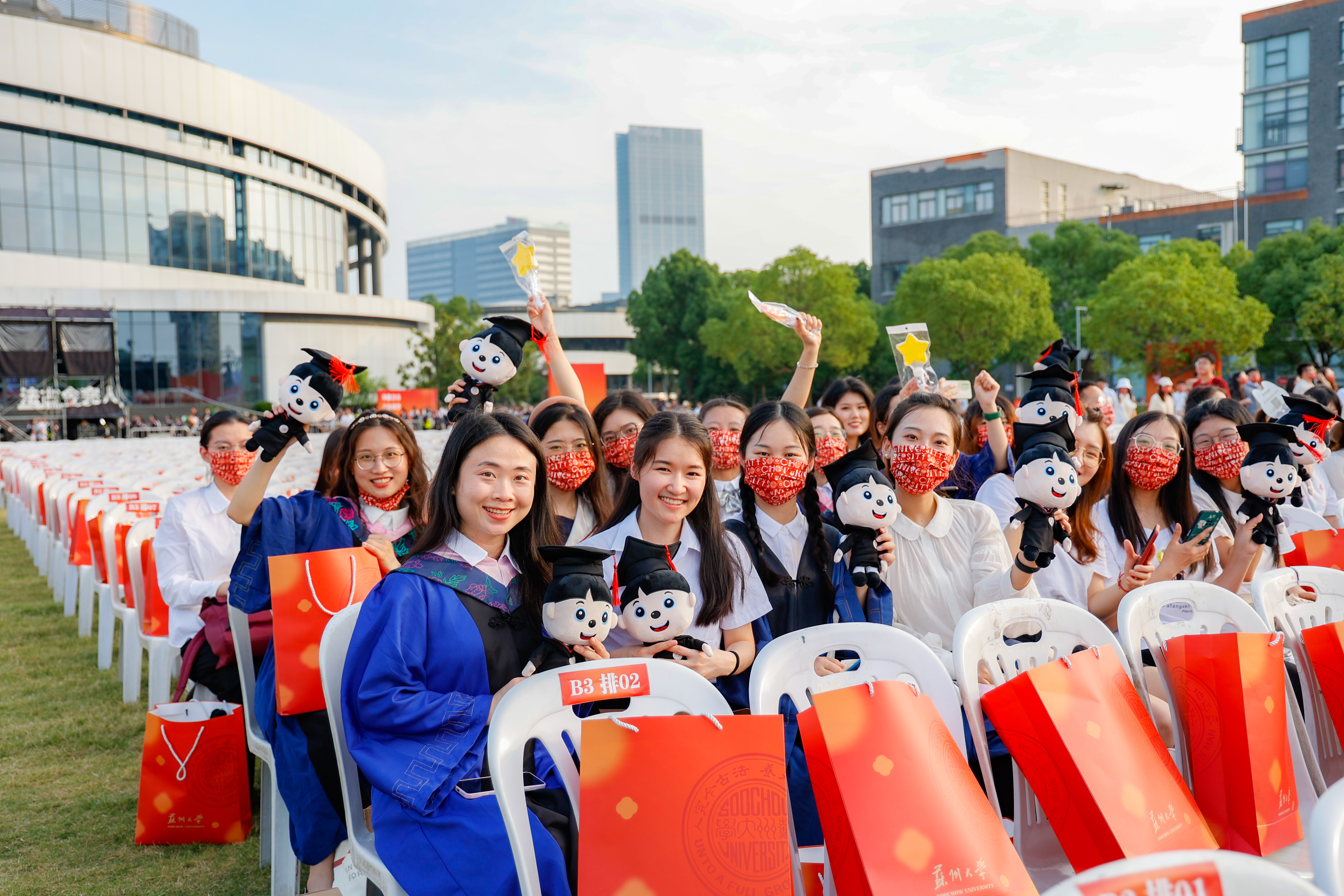 毕业季里,学校为每一位毕业生精心准备了储存大学记忆的“金钥匙”,里面存放着个人大数据,承载着毕业学子在母校学习生活的温暖点滴。还有为每位同学提前准备的伴手礼包,里面装有小苏玩偶、苏大校徽、印有“SOOCHOW UNIVERSITY ”和苏大标志性建筑的定制口罩、闪光棒等精致小礼品,颇受学生喜爱。值得一提的是,苏州市、苏州工业园区特意通过苏州地标建筑东方之门,为苏大毕业生送上了祝福,让全体苏大人充分感受到了苏州的温暖。