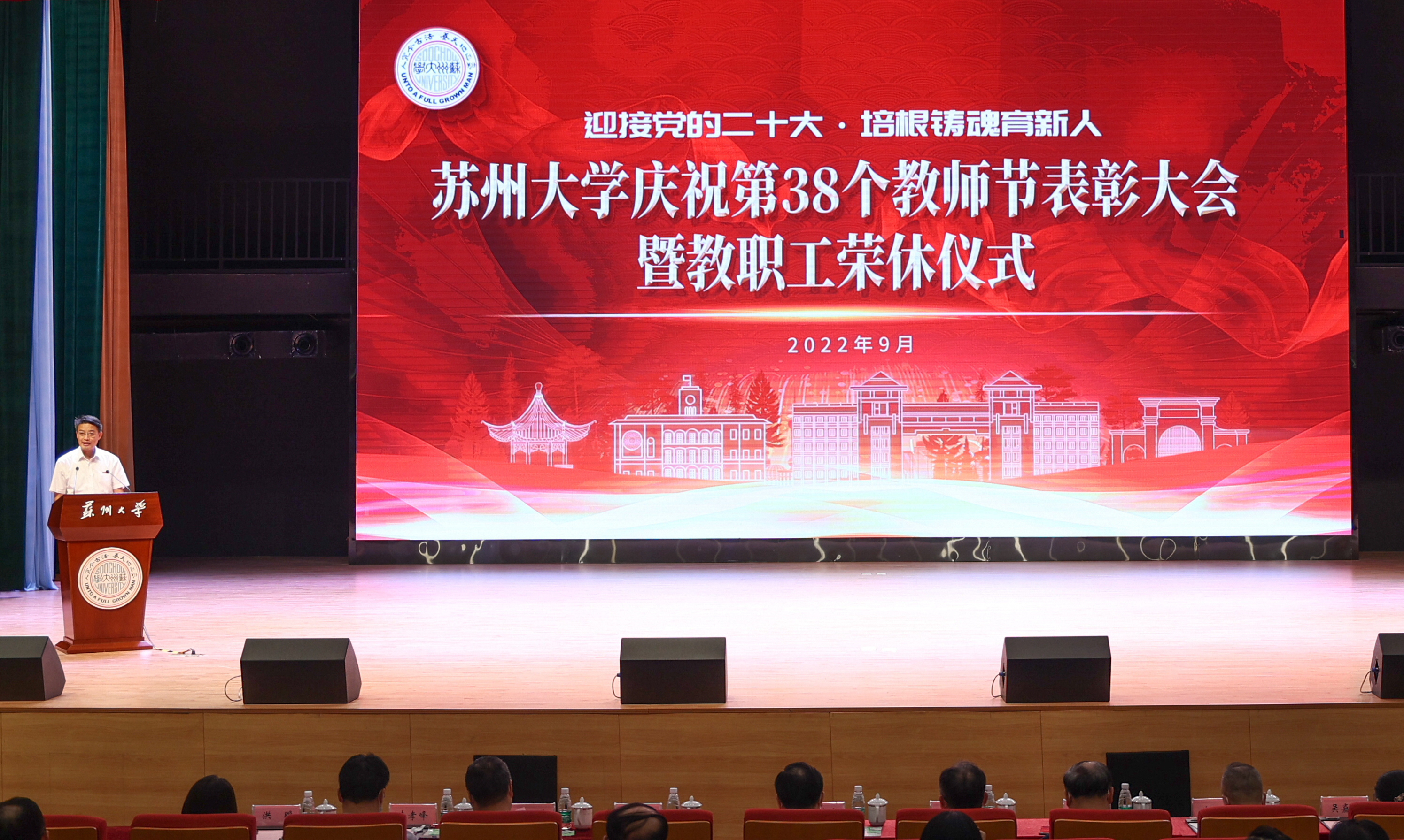 座谈会后,学校在存菊堂举行庆祝第38个教师节表彰大会暨教职工荣休仪式。校党委副书记、校长张晓宏,在校校领导,“高尚师德”奖教金获奖教师,荣休教职工及工作满30年的教职工代表,各学院(部)、部门、直属单位主要负责人以及师生代表等出席会议。会议由校党委副书记邓敏主持。