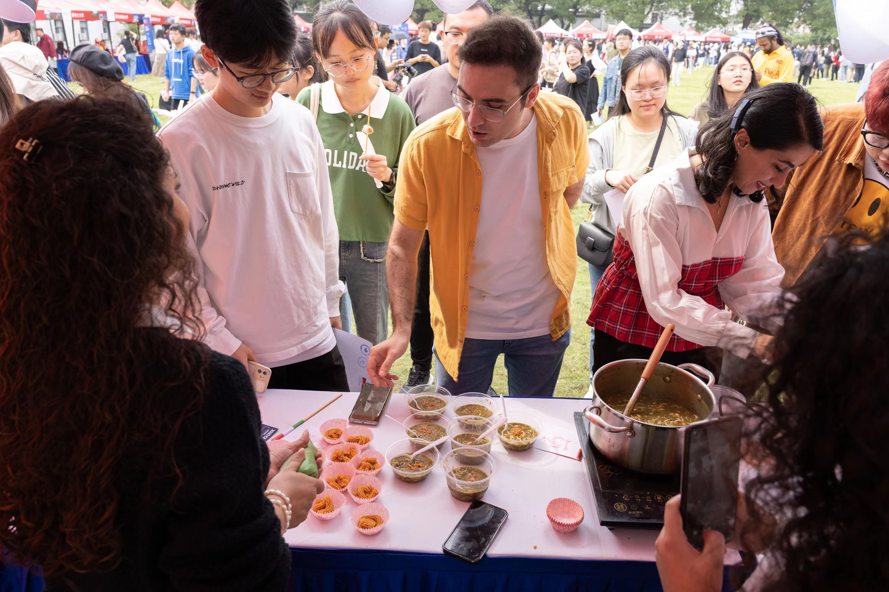 在尼日利亚展台,材料与化学化工学部硕士研究生高鸣昶与留学生来了一场音乐交流,冬不拉与非洲鼓跨越千山万水,在此碰撞出花火,共同演绎辽阔的草原风味。激情的交流演绎吸引了师生们驻足围观,他们跟着鼓点拍手打节奏。“一起玩音乐非常开心!”高鸣昶说,现场的文化交流氛围特别火热。“欢迎品尝我们的捞面!”来自印度尼西亚的苏大留学生他路热情招呼着师生,介绍当地美食文化。今年是他路来到中国的第八年,他说,很高兴能够参加此次活动,苏大国际周营造了浓厚的国际交流氛围,这样的机会弥足珍贵。