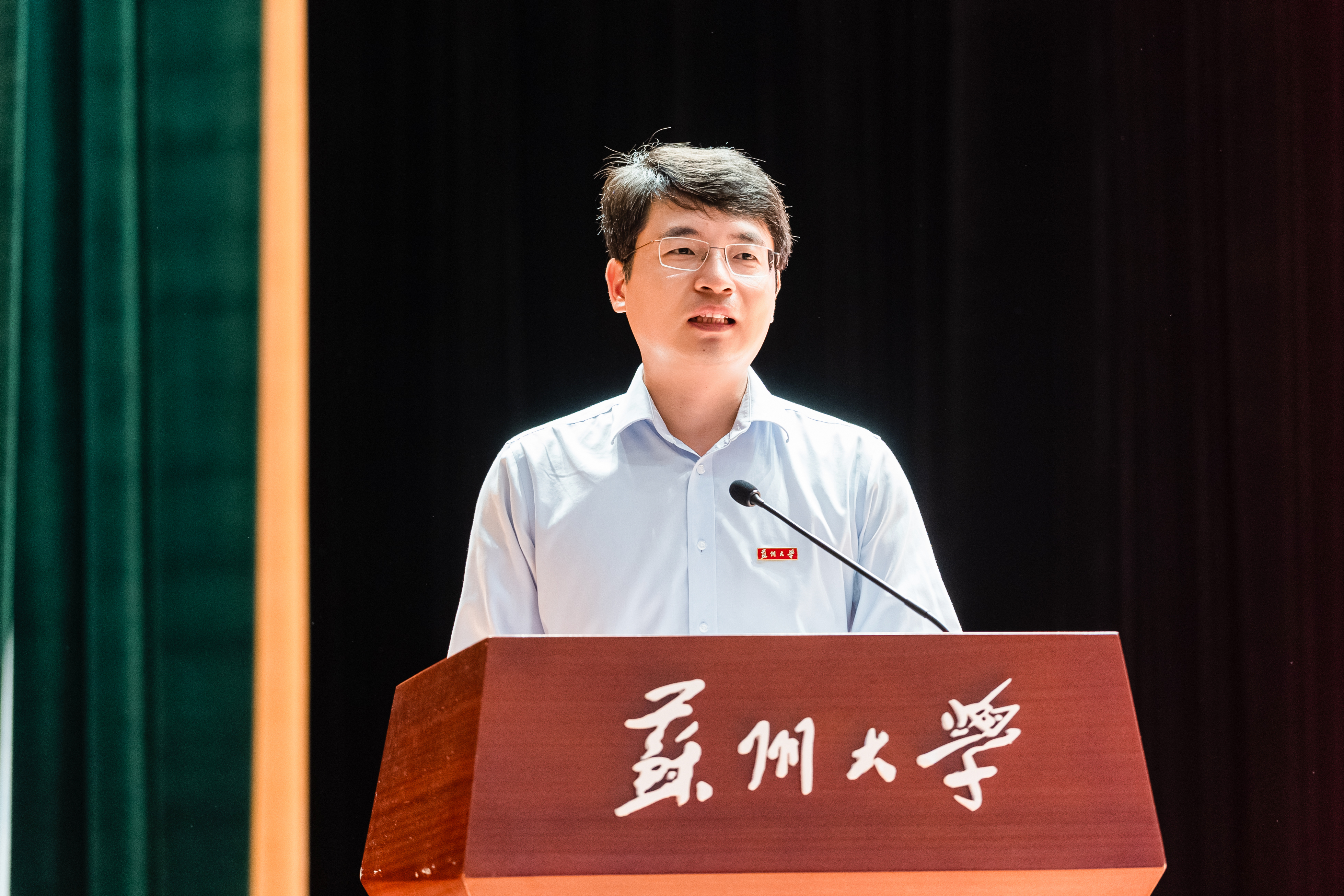 张桥向新教师代表颁发校徽,赠予《leyu·乐鱼(中国)体育官方网站校史》《倷好苏大》,并讲授“入职第一课”。