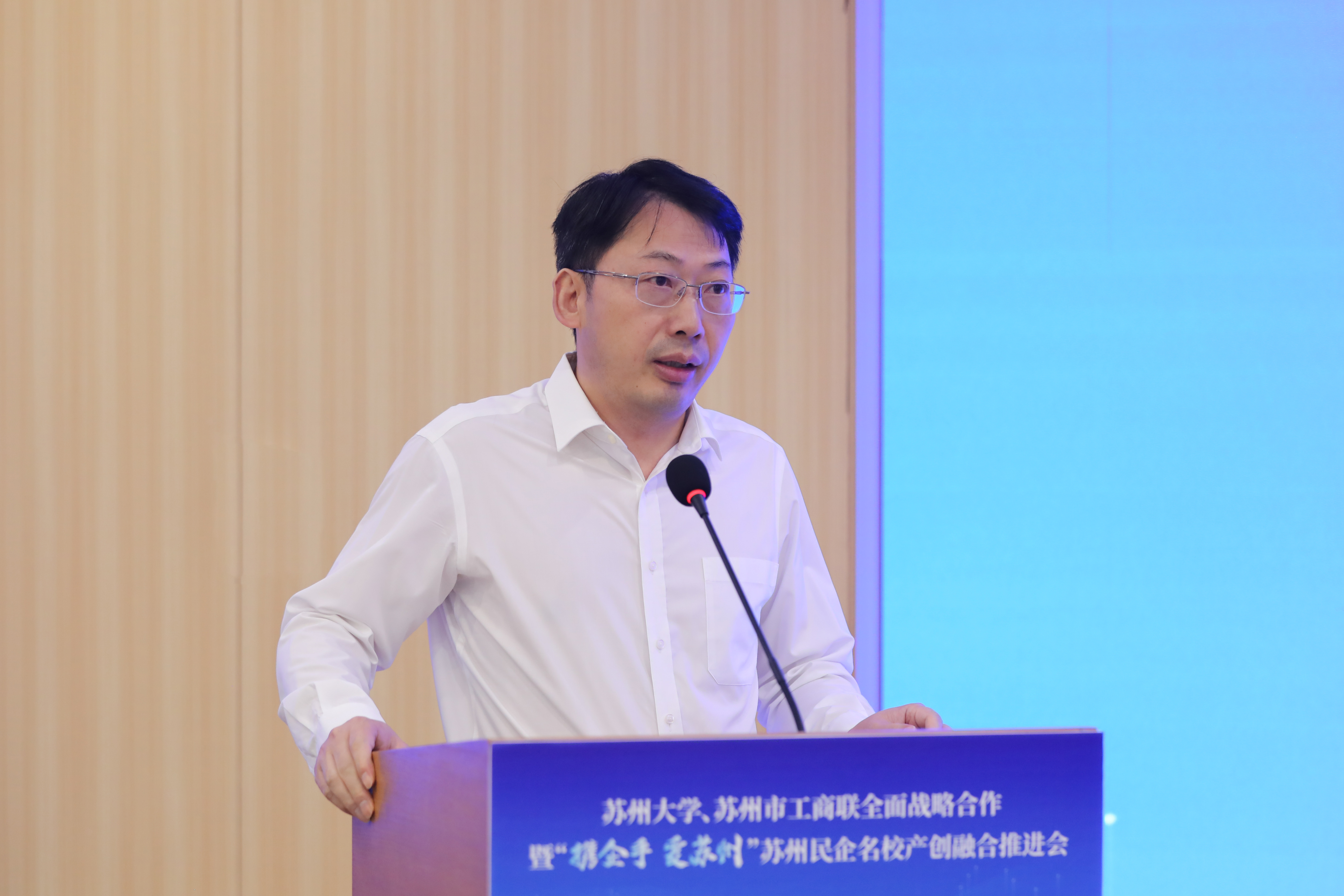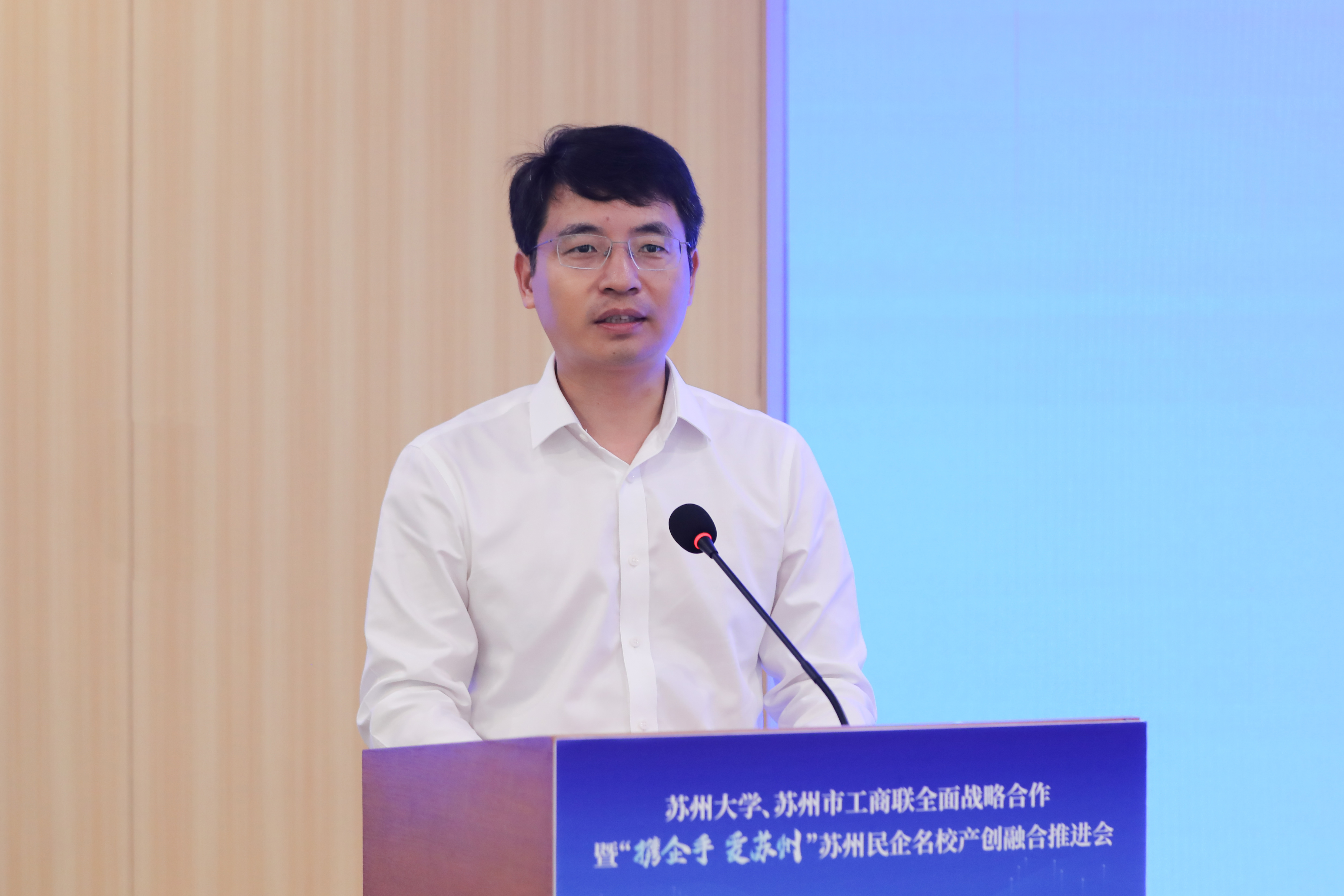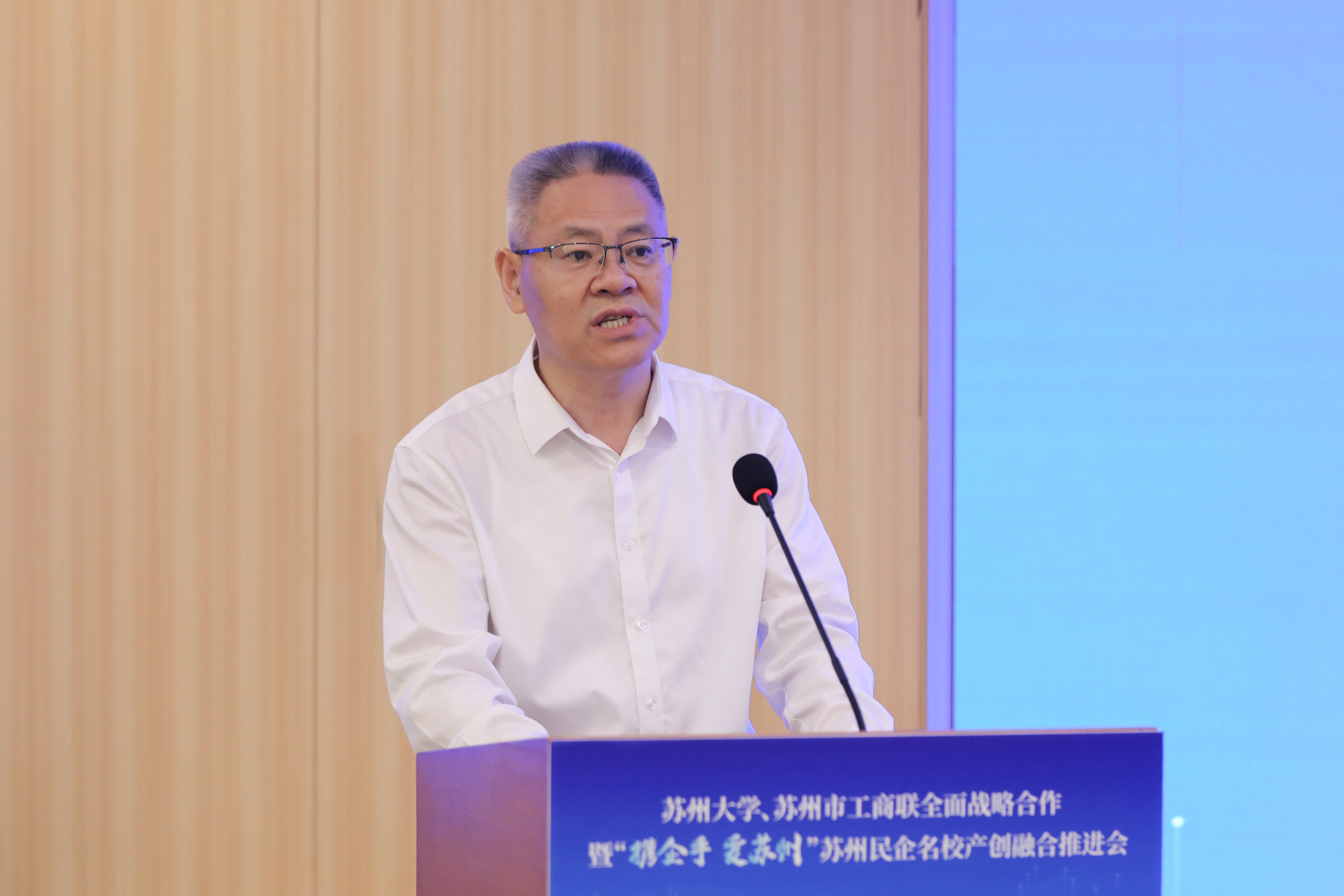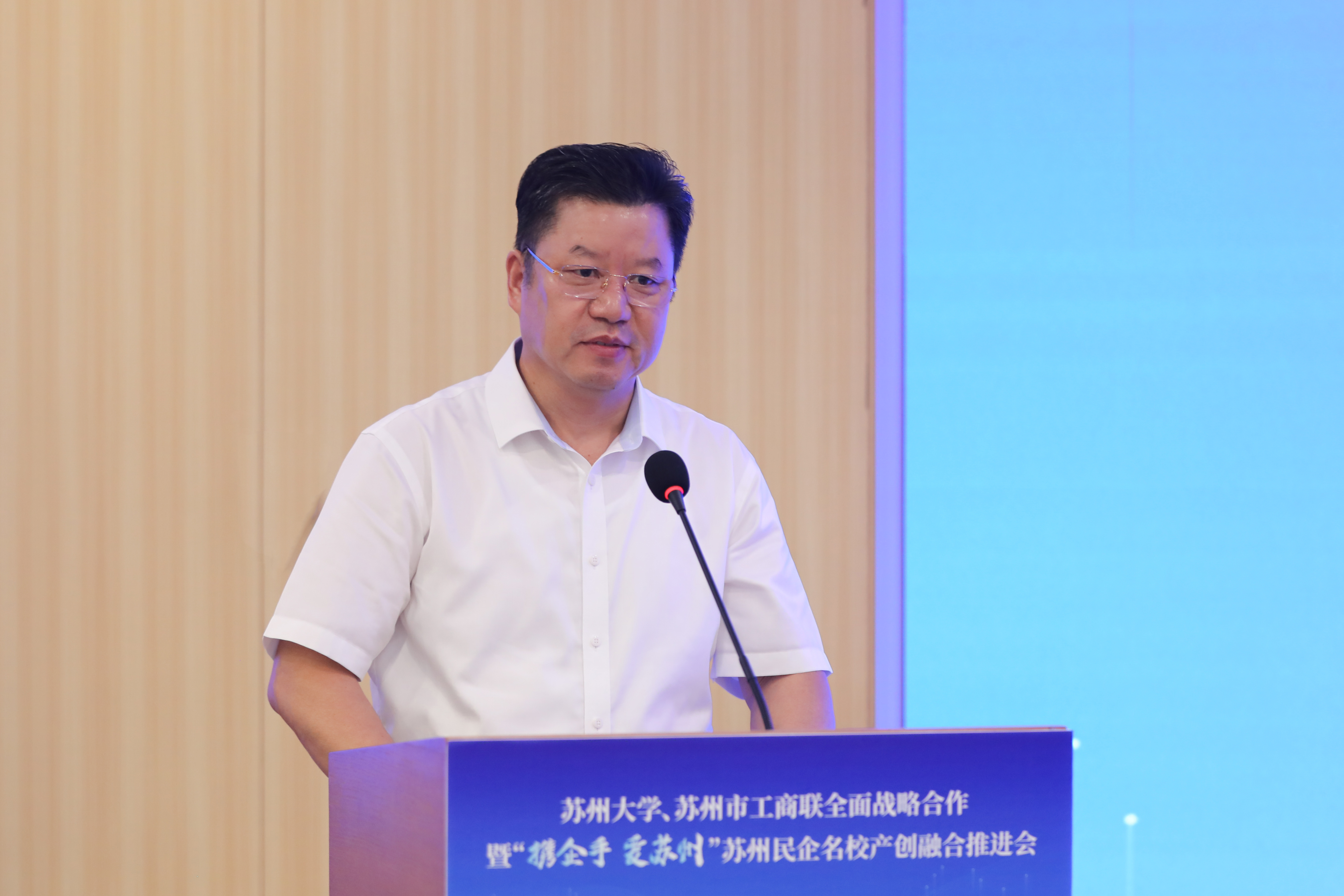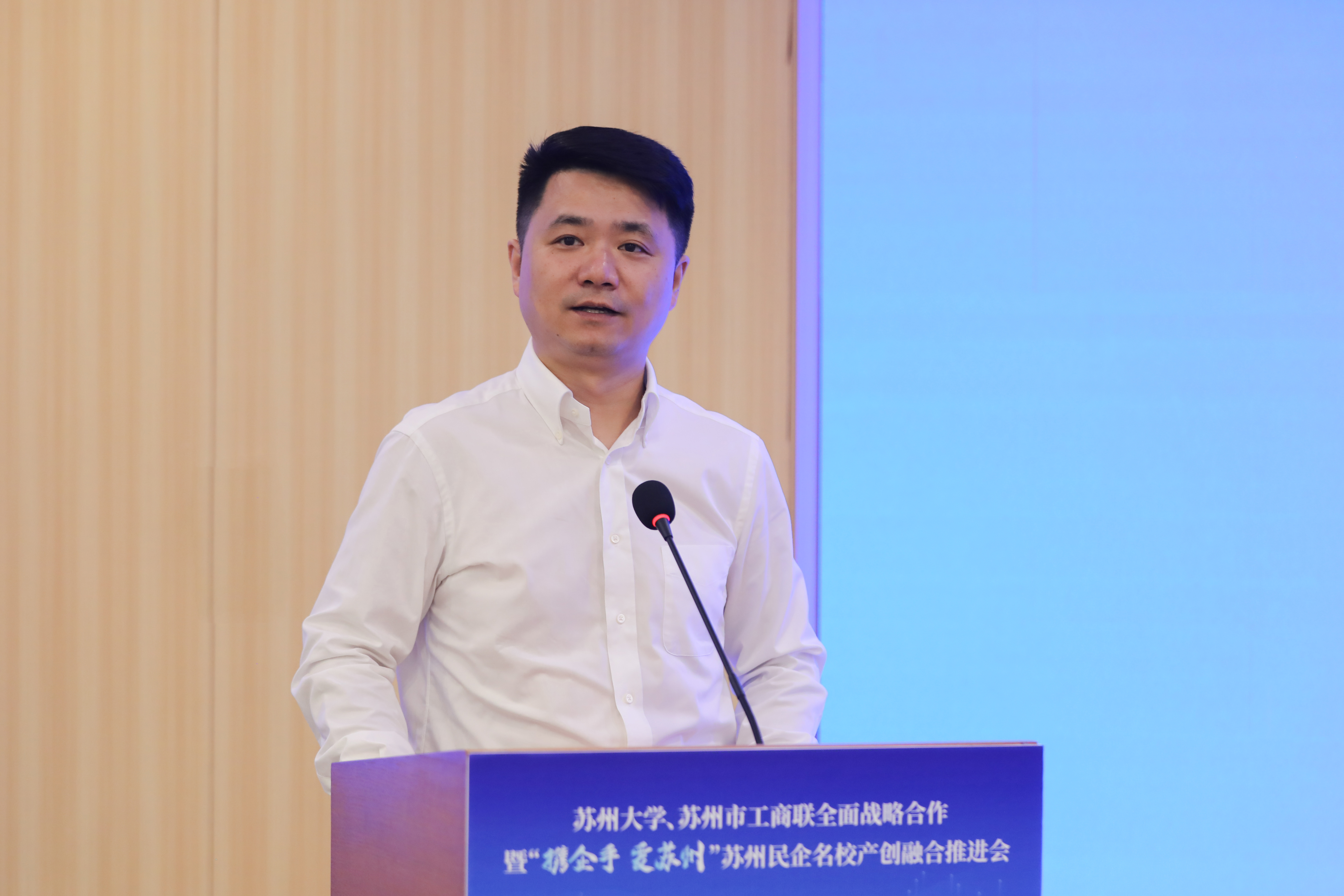 周俊指出,市工商联作为连接政府与民营企业的桥梁纽带,始终致力于为企业搭建资源对接平台,推动“两个健康”发展。民营企业是苏州高质量发展的生力军,此次合作是积极响应苏州“1030”产业体系建设的具体行动,是促进民企名校产创融合的重要举措。市工商联将以此次推进会为契机,架好商(协)会与苏大常态化对接的“连心桥”,当好“产学研用”协同创新的“服务者”,做好科技研发平台持续建设的“推动者”,为苏州民营经济高质量发展和创新型城市建设书写新篇章。