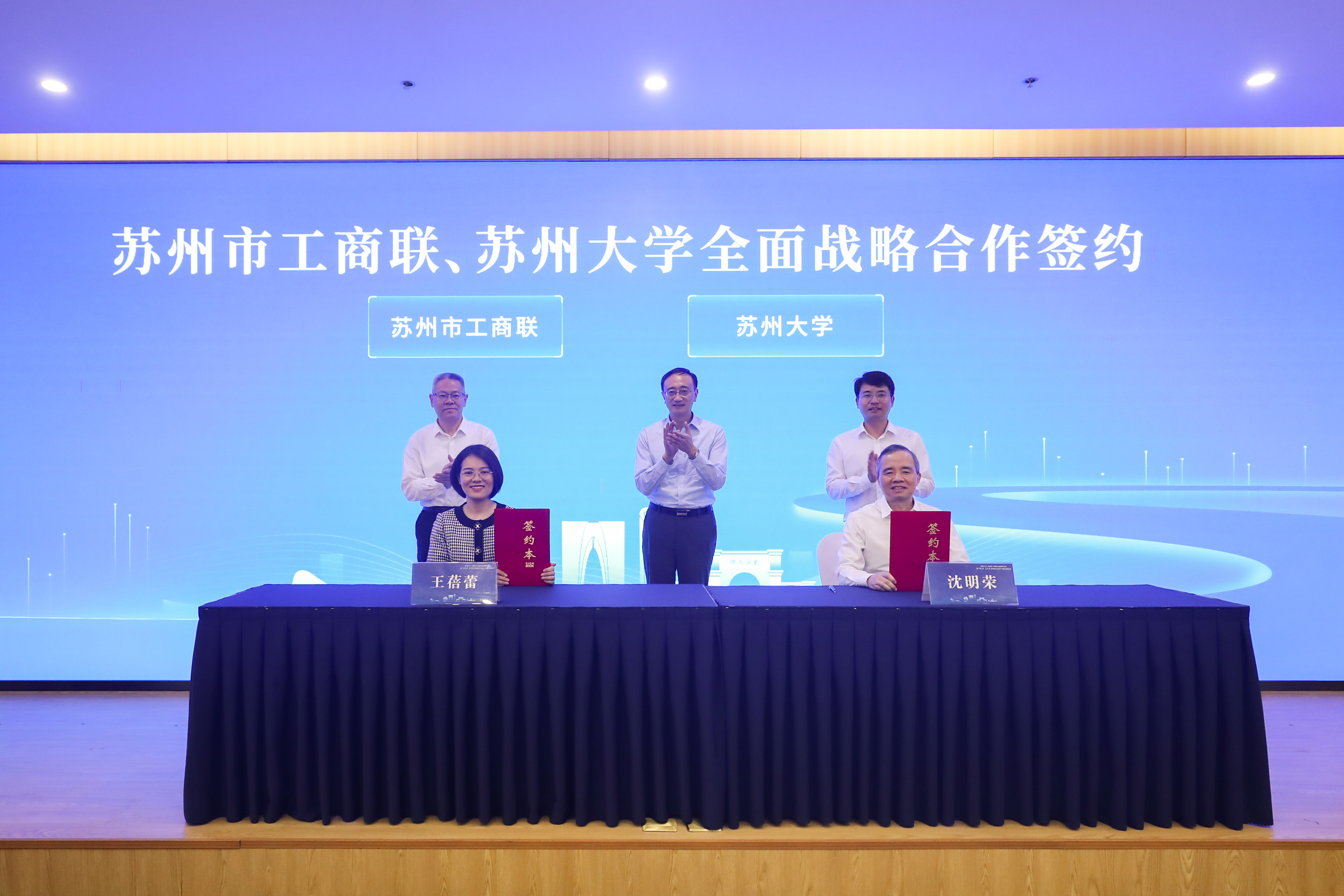 为深化高校、商(协)会、民营企业在党建共建、产业赋能、创新生态、人才引育等方面的资源共享、优势互补,王蓓蕾与沈明荣签订苏州市工商联、leyu·乐鱼(中国)体育官方网站战略合作协议。王飏、周俊、张桥共同见证。