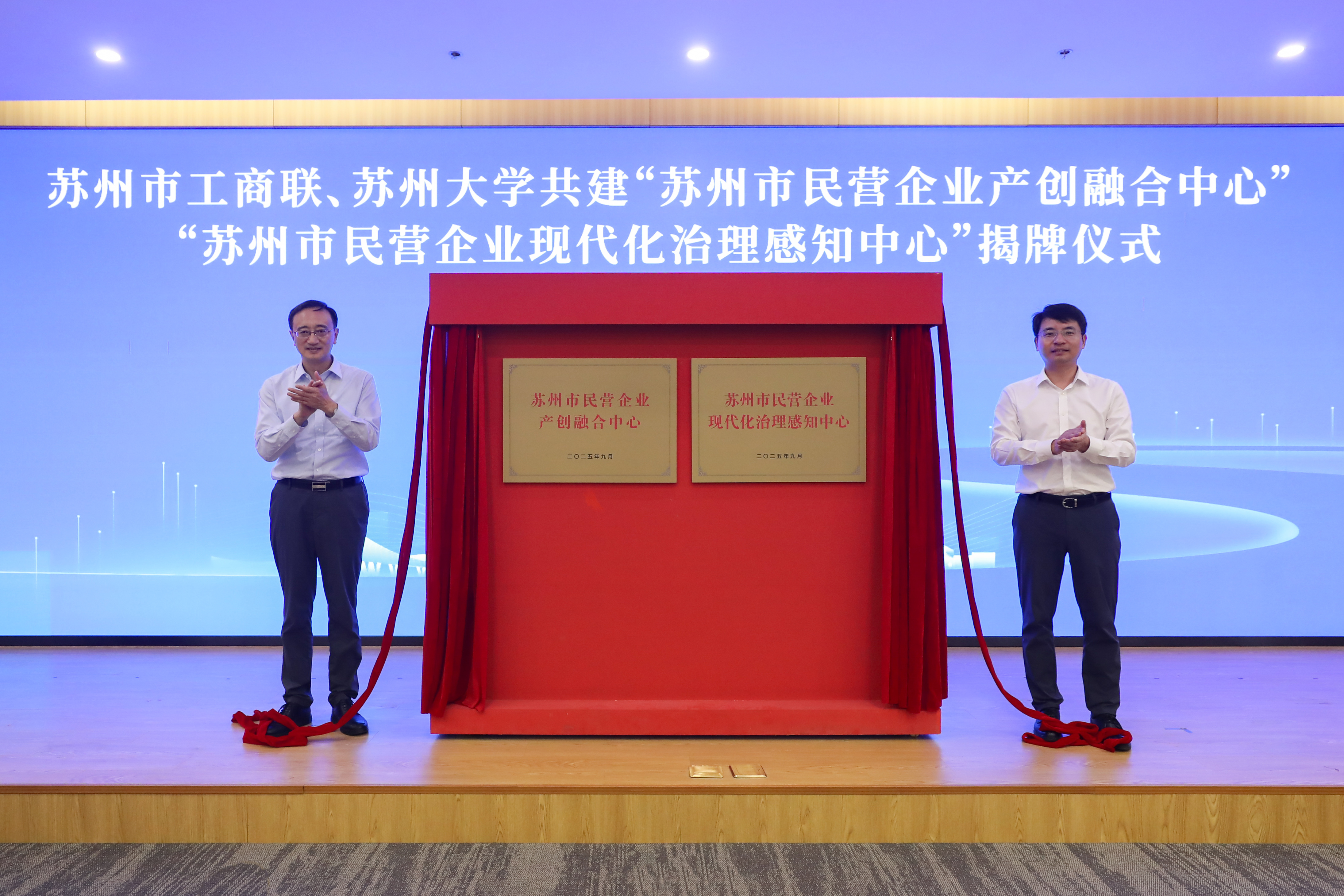 王飏与张桥为“苏州市民营企业产创融合中心”“苏州市民营企业现代化治理感知中心”揭牌。苏州市工商联将与leyu·乐鱼(中国)体育官方网站一同为民营企业提供技术研发、人才培养、成果转化、现代化治理的一站式服务。