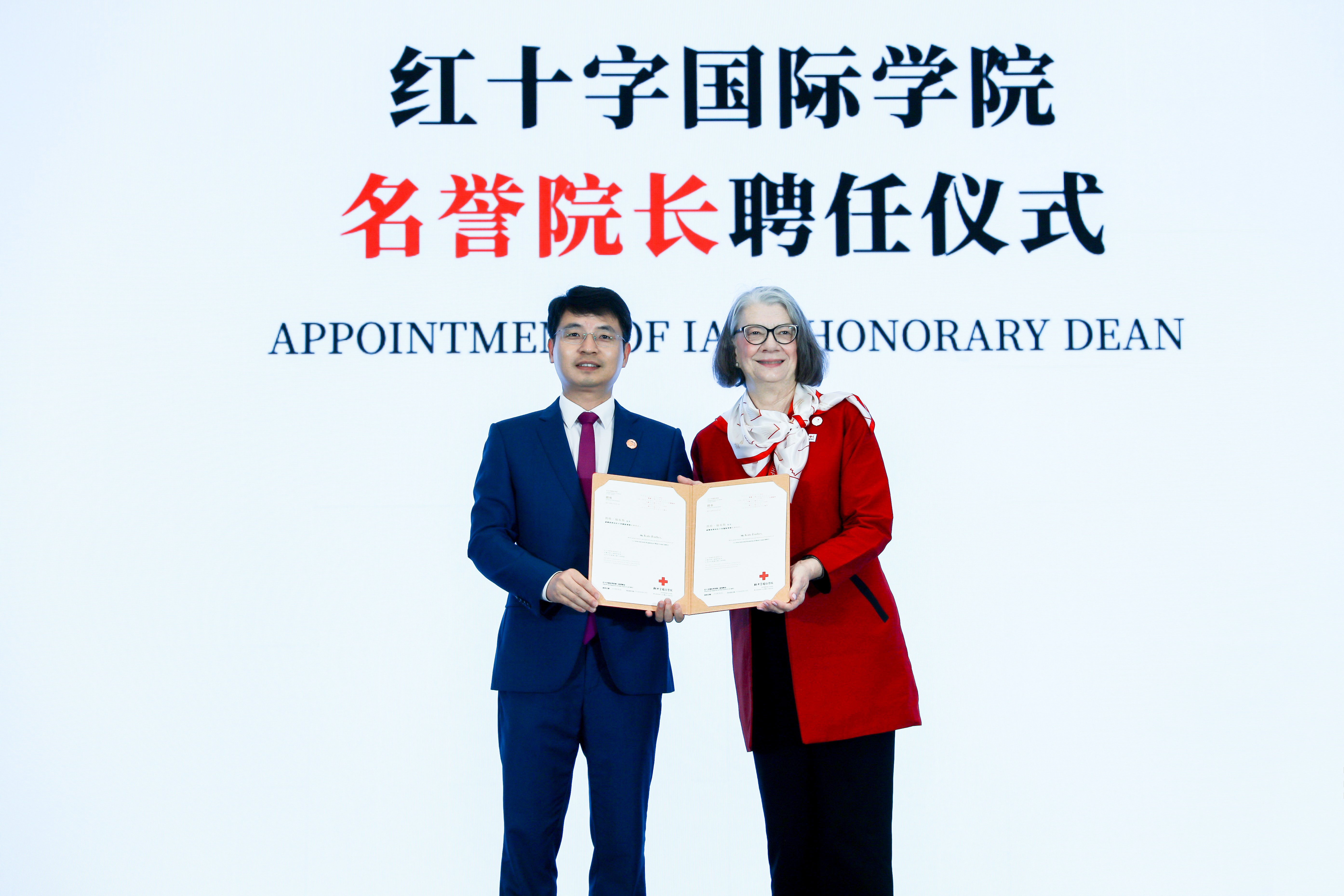 开幕式上,张桥为凯特·福布斯颁发红十字国际学院名誉院长聘书。