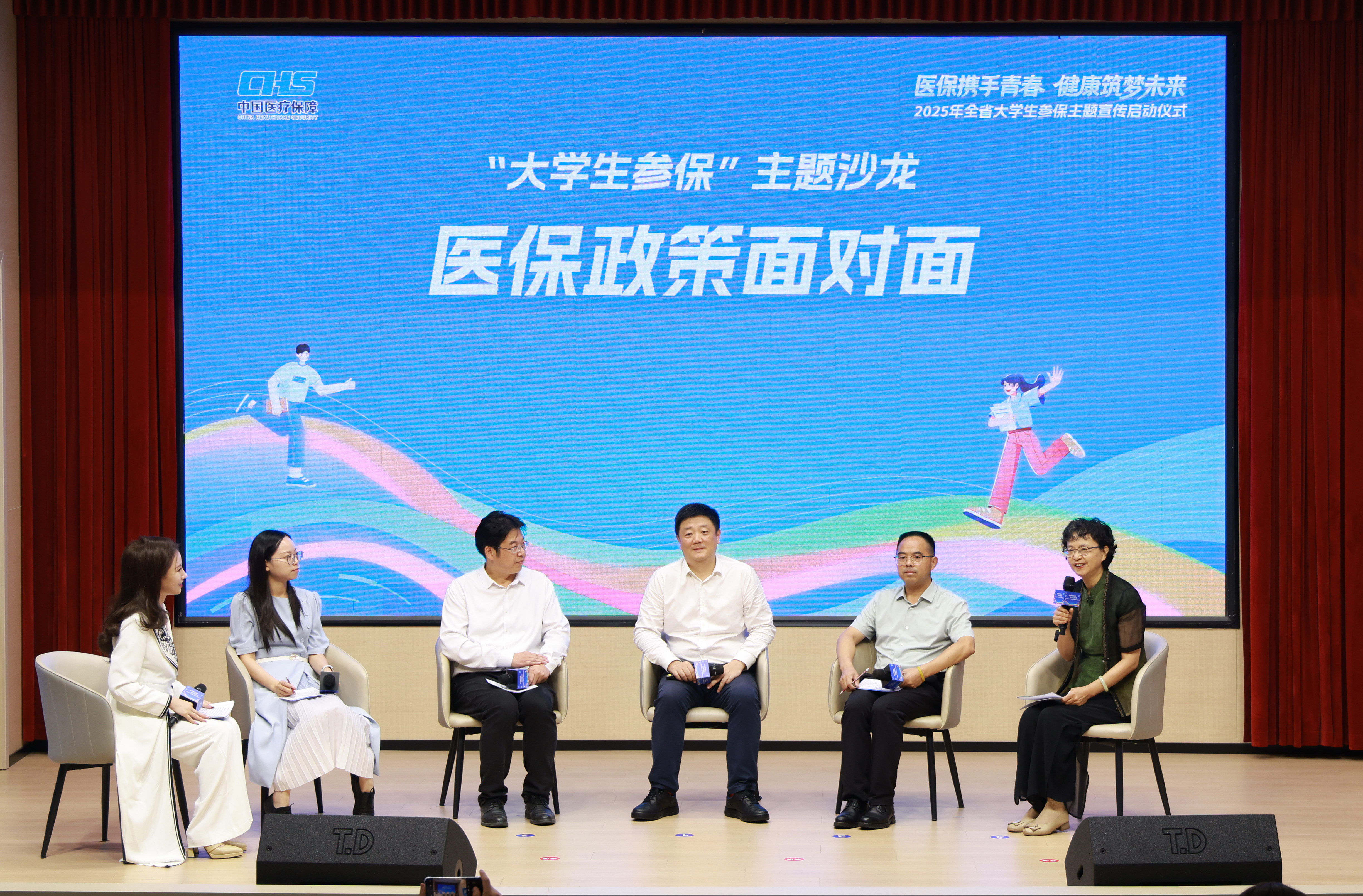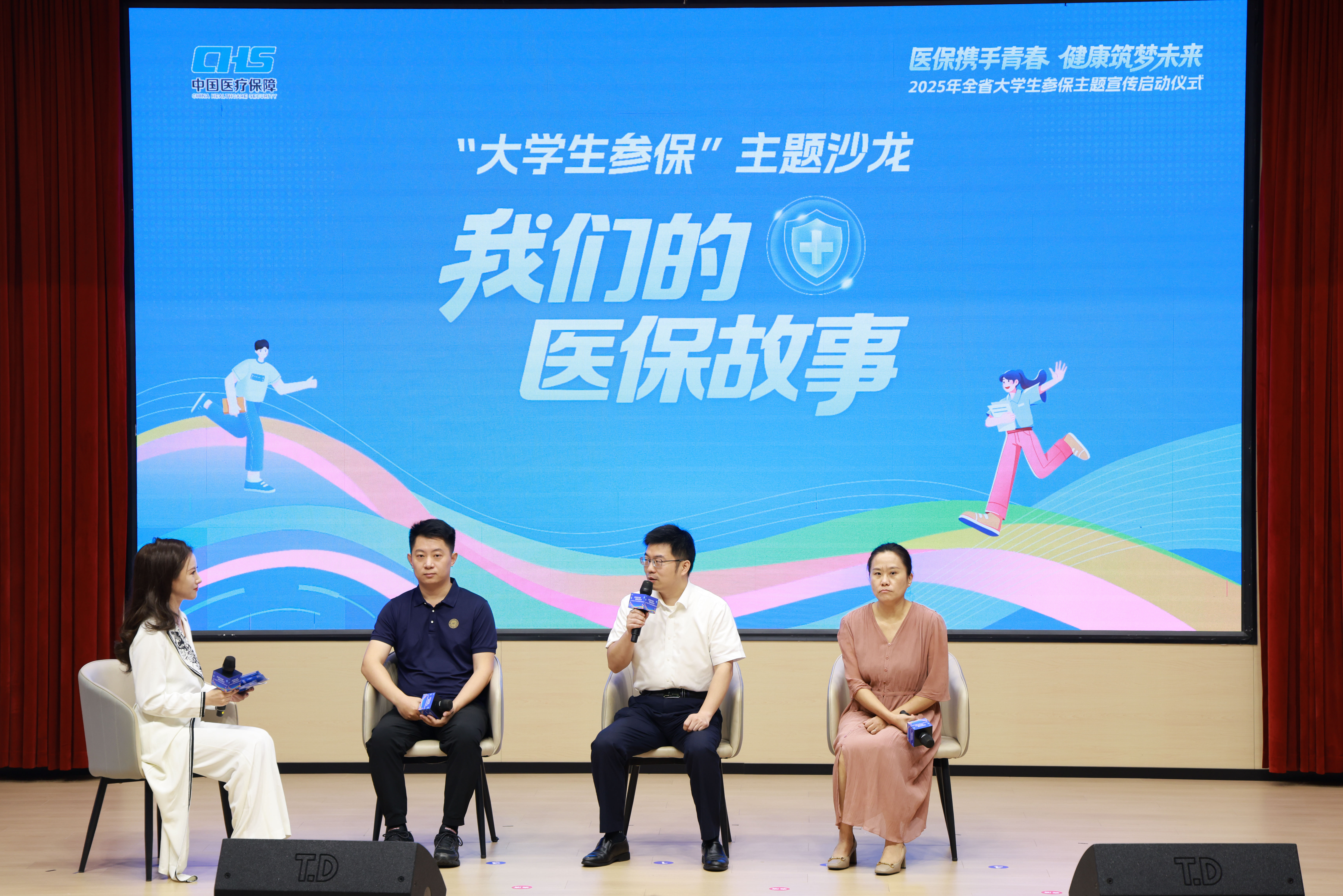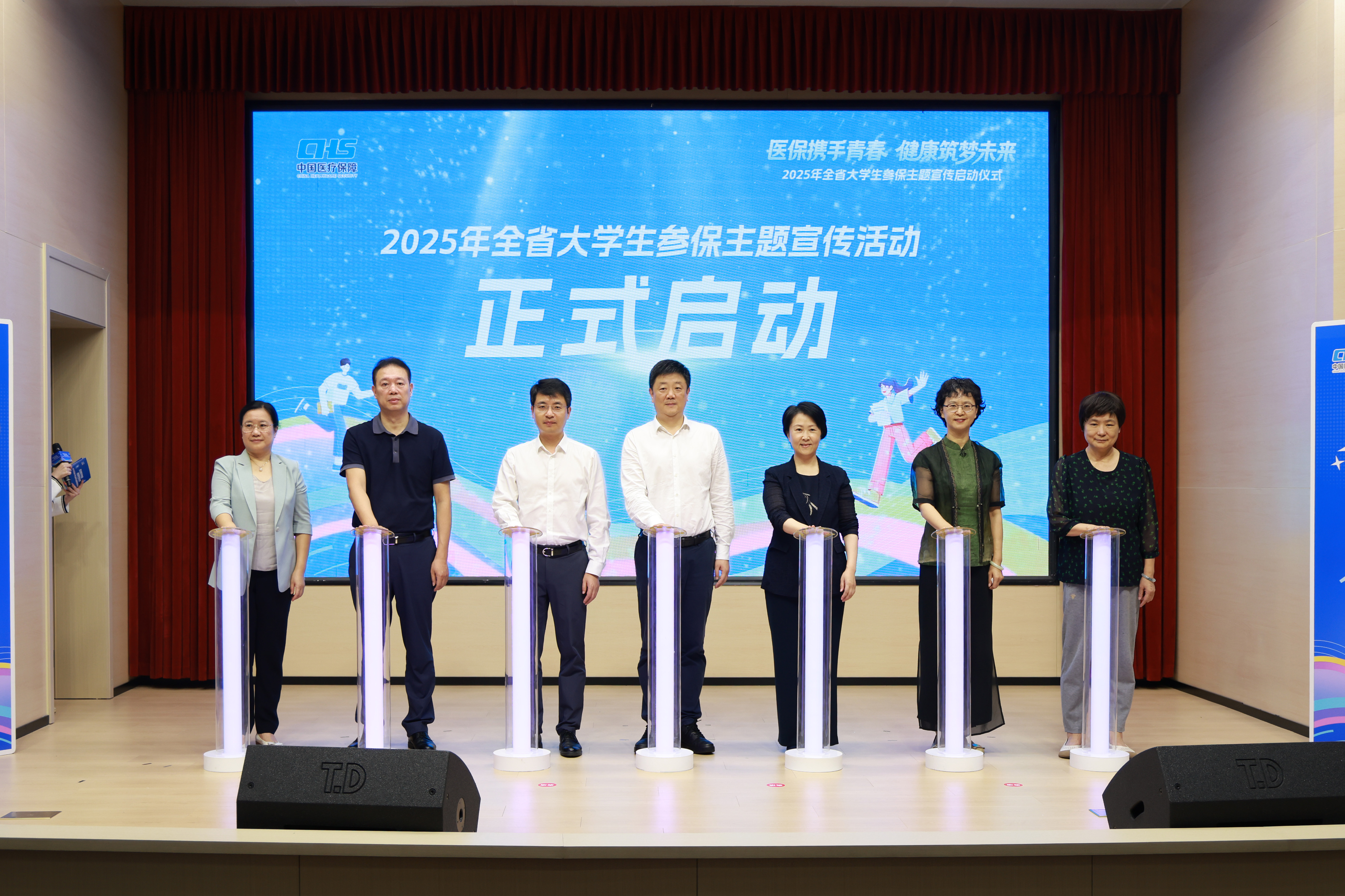 启动仪式上,陈亮、张桥、季晶、崔春霞、丁报庆、施静芝、施燕萍共同上台,为2025年全省大学生参保主题宣传活动启幕。