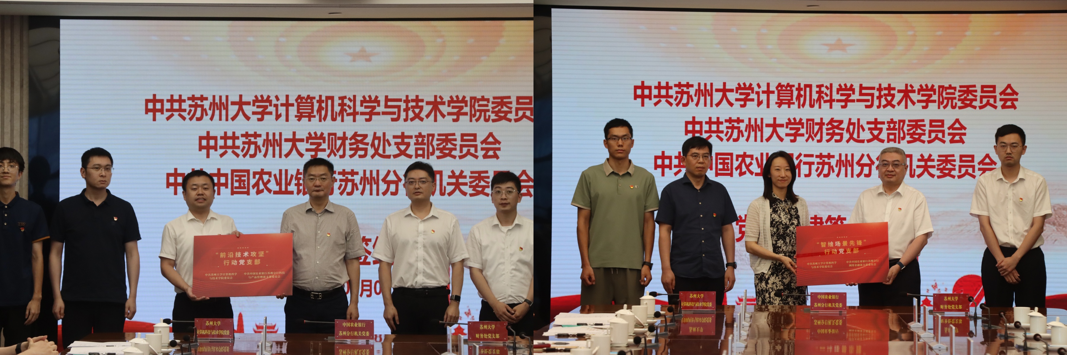 计算机科学与技术学院党委书记陈国凤、财务处党支部书记陈永清与农行苏州分行党委委员、副行长张曾博作为代表签署党建共建协议。洪晔、吴忠辉及双方与会代表共同见证。
